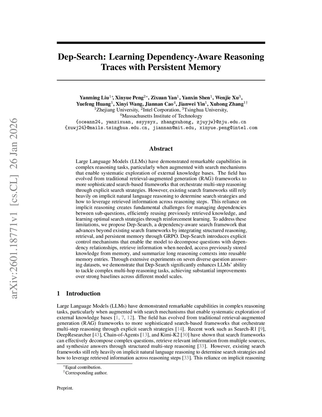 Large Language Models (LLMs) have demonstrated remarkable capabilities in complex reasoning tasks, particularly when augmented with search mechanisms that enable systematic exploration of external knowledge bases. The field has evolved from traditional retrieval-augmented generation (RAG) frameworks to more sophisticated search-based frameworks that orchestrate multi-step reasoning through explicit search strategies. However, existing search frameworks still rely heavily on implicit natural language reasoning to determine search strategies and how to leverage retrieved information across reasoning steps. This reliance on implicit reasoning creates fundamental challenges for managing dependencies between sub-questions, efficiently reusing previously retrieved knowledge, and learning optimal search strategies through reinforcement learning. To address these limitations, we propose Dep-Search, a dependency-aware search framework that advances beyond existing search frameworks by integrating structured reasoning, retrieval, and persistent memory through GRPO. Dep-Search introduces explicit control mechanisms that enable the model to decompose questions with dependency relationships, retrieve information when needed, access previously stored knowledge from memory, and summarize long reasoning contexts into reusable memory entries. Through extensive experiments on seven diverse question answering datasets, we demonstrate that Dep-Search significantly enhances LLMs' ability to tackle complex multi-hop reasoning tasks, achieving substantial improvements over strong baselines across different model scales.