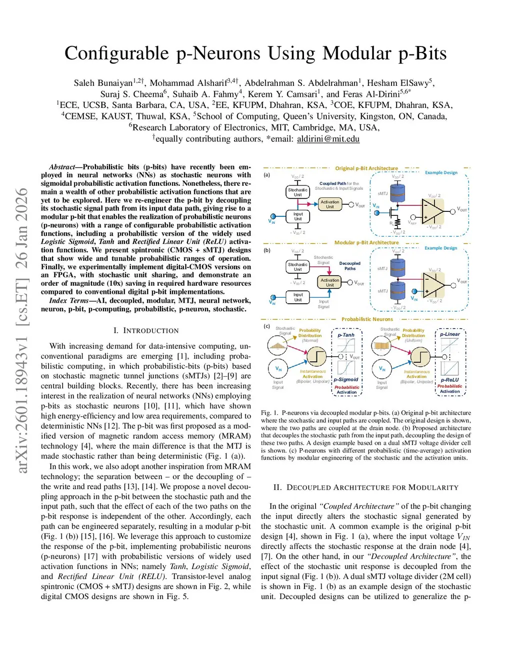 Probabilistic bits (p-bits) have recently been employed in neural networks (NNs) as stochastic neurons with sigmoidal probabilistic activation functions. Nonetheless, there remain a wealth of other probabilistic activation functions that are yet to be explored. Here we re-engineer the p-bit by decoupling its stochastic signal path from its input data path, giving rise to a modular p-bit that enables the realization of probabilistic neurons (p-neurons) with a range of configurable probabilistic activation functions, including a probabilistic version of the widely used Logistic Sigmoid, Tanh and Rectified Linear Unit (ReLU) activation functions. We present spintronic (CMOS + sMTJ) designs that show wide and tunable probabilistic ranges of operation. Finally, we experimentally implement digital-CMOS versions on an FPGA, with stochastic unit sharing, and demonstrate an order of magnitude (10x) saving in required hardware resources compared to conventional digital p-bit implementations.