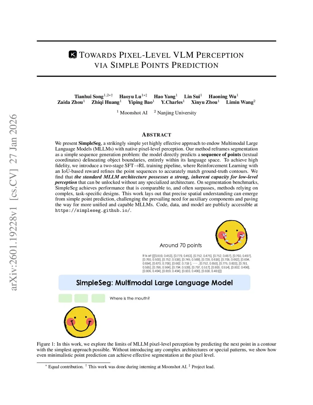 We present SimpleSeg, a strikingly simple yet highly effective approach to endow Multimodal Large Language Models (MLLMs) with native pixel-level perception. Our method reframes segmentation as a simple sequence generation problem: the model directly predicts sequences of points (textual coordinates) delineating object boundaries, entirely within its language space. To achieve high fidelity, we introduce a two-stage SFRL training pipeline, where Reinforcement Learning with an IoU-based reward refines the point sequences to accurately match ground-truth contours. We find that the standard MLLM architecture possesses a strong, inherent capacity for low-level perception that can be unlocked without any specialized architecture. On segmentation benchmarks, SimpleSeg achieves performance that is comparable to, and often surpasses, methods relying on complex, task-specific designs. This work lays out that precise spatial understanding can emerge from simple point prediction, challenging the prevailing need for auxiliary components and paving the way for more unified and capable VLMs. Homepage:this https URL