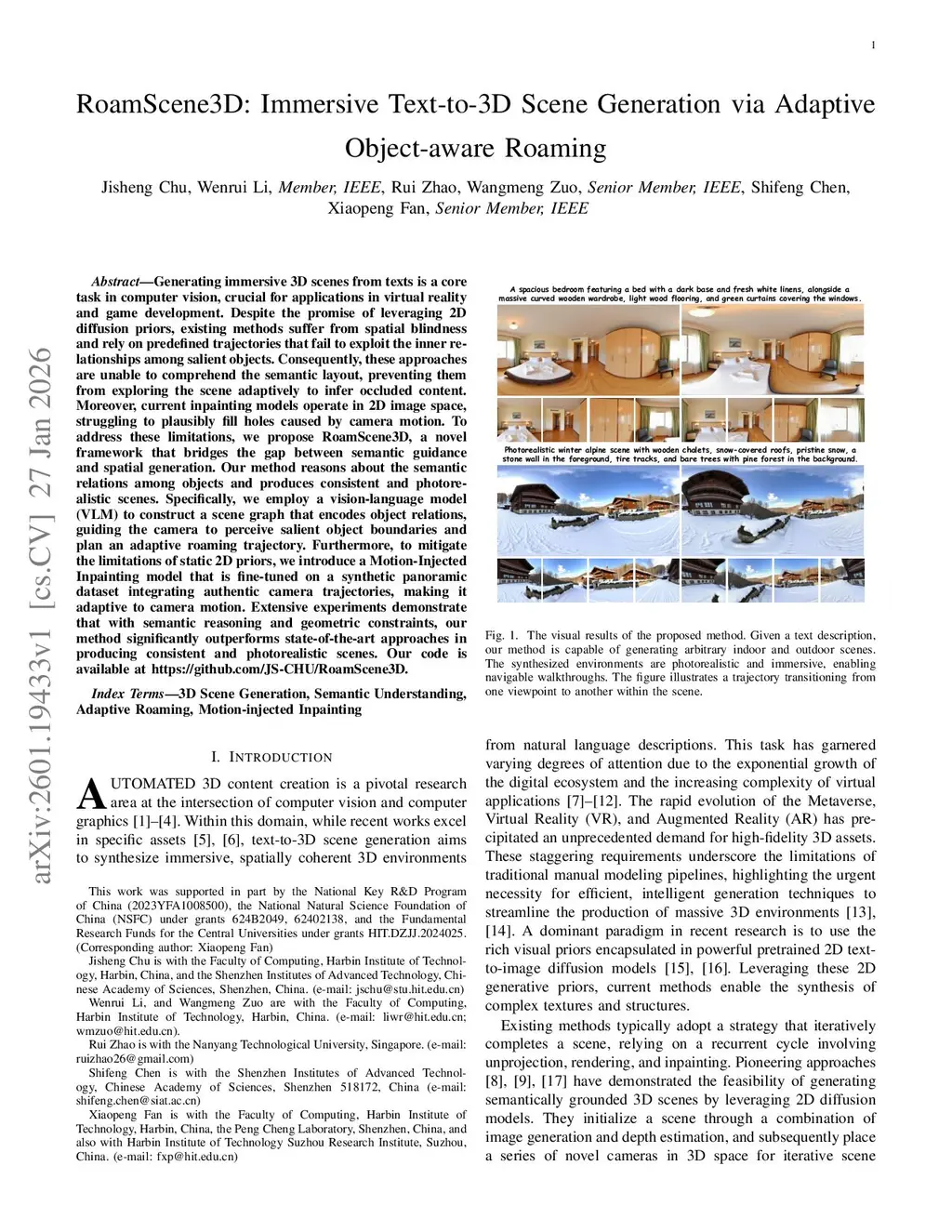 Generating immersive 3D scenes from texts is a core task in computer vision, crucial for applications in virtual reality and game development. Despite the promise of leveraging 2D diffusion priors, existing methods suffer from spatial blindness and rely on predefined trajectories that fail to exploit the inner relationships among salient objects. Consequently, these approaches are unable to comprehend the semantic layout, preventing them from exploring the scene adaptively to infer occluded content. Moreover, current inpainting models operate in 2D image space, struggling to plausibly fill holes caused by camera motion. To address these limitations, we propose RoamScene3D, a novel framework that bridges the gap between semantic guidance and spatial generation. Our method reasons about the semantic relations among objects and produces consistent and photorealistic scenes. Specifically, we employ a vision-language model (VLM) to construct a scene graph that encodes object relations, guiding the camera to perceive salient object boundaries and plan an adaptive roaming trajectory. Furthermore, to mitigate the limitations of static 2D priors, we introduce a Motion-Injected Inpainting model that is fine-tuned on a synthetic panoramic dataset integrating authentic camera trajectories, making it adaptive to camera motion. Extensive experiments demonstrate that with semantic reasoning and geometric constraints, our method significantly outperforms state-of-the-art approaches in producing consistent and photorealistic scenes. Our code is available atthis https URL.