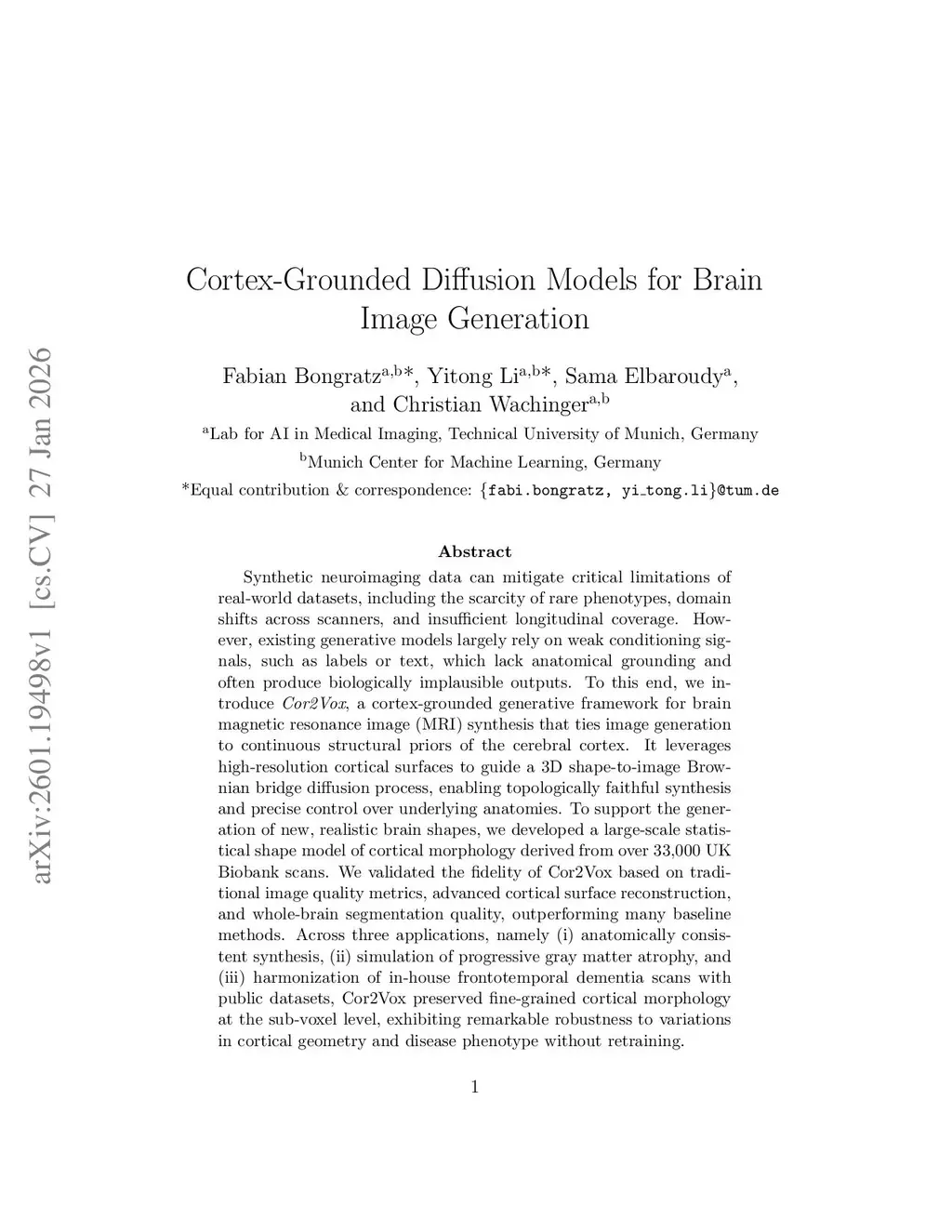 Synthetic neuroimaging data can mitigate critical limitations of real-world datasets, including the scarcity of rare phenotypes, domain shifts across scanners, and insufficient longitudinal coverage. However, existing generative models largely rely on weak conditioning signals, such as labels or text, which lack anatomical grounding and often produce biologically implausible outputs. To this end, we introduce Cor2Vox, a cortex-grounded generative framework for brain magnetic resonance image (MRI) synthesis that ties image generation to continuous structural priors of the cerebral cortex. It leverages high-resolution cortical surfaces to guide a 3D shape-to-image Brownian bridge diffusion process, enabling topologically faithful synthesis and precise control over underlying anatomies. To support the generation of new, realistic brain shapes, we developed a large-scale statistical shape model of cortical morphology derived from over 33,000 UK Biobank scans. We validated the fidelity of Cor2Vox based on traditional image quality metrics, advanced cortical surface reconstruction, and whole-brain segmentation quality, outperforming many baseline methods. Across three applications, namely (i) anatomically consistent synthesis, (ii) simulation of progressive gray matter atrophy, and (iii) harmonization of in-house frontotemporal dementia scans with public datasets, Cor2Vox preserved fine-grained cortical morphology at the sub-voxel level, exhibiting remarkable robustness to variations in cortical geometry and disease phenotype without retraining.