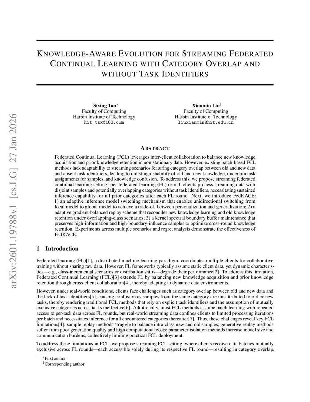 Federated Continual Learning (FCL) leverages inter-client collaboration to balance new knowledge acquisition and prior knowledge retention in non-stationary data. However, existing batch-based FCL methods lack adaptability to streaming scenarios featuring category overlap between old and new data and absent task identifiers, leading to indistinguishability of old and new knowledge, uncertain task assignments for samples, and knowledgethis http URLaddress this, we propose streaming federated continual learning setting: per federated learning (FL) round, clients process streaming data with disjoint samples and potentially overlapping categories without task identifiers, necessitating sustained inference capability for all prior categories after each FLthis http URL, we introduce FedKACE: 1) an adaptive inference model switching mechanism that enables unidirectional switching from local model to global model to achieve a trade-off between personalization and generalization; 2) a adaptive gradient-balanced replay scheme that reconciles new knowledge learning and old knowledge retention under overlapping-class scenarios; 3) a kernel spectral boundary buffer maintenance that preserves high-information and high-boundary-influence samples to optimize cross-round knowledge retention. Experiments across multiple scenarios and regret analysis demonstrate the effectiveness of FedKACE.
