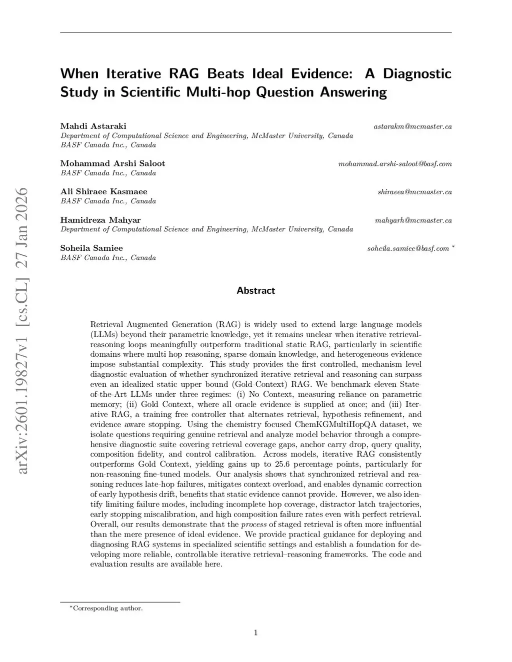 Retrieval-Augmented Generation (RAG) extends large language models (LLMs) beyond parametric knowledge, yet it is unclear when iterative retrieval-reasoning loops meaningfully outperform static RAG, particularly in scientific domains with multi-hop reasoning, sparse domain knowledge, and heterogeneous evidence. We provide the first controlled, mechanism-level diagnostic study of whether synchronized iterative retrieval and reasoning can surpass an idealized static upper bound (Gold Context) RAG. We benchmark eleven state-of-the-art LLMs under three regimes: (i) No Context, measuring reliance on parametric memory; (ii) Gold Context, where all oracle evidence is supplied at once; and (iii) Iterative RAG, a training-free controller that alternates retrieval, hypothesis refinement, and evidence-aware stopping. Using the chemistry-focused ChemKGMultiHopQA dataset, we isolate questions requiring genuine retrieval and analyze behavior with diagnostics spanning retrieval coverage gaps, anchor-carry drop, query quality, composition fidelity, and control calibration. Across models, Iterative RAG consistently outperforms Gold Context, with gains up to 25.6 percentage points, especially for non-reasoning fine-tuned models. Staged retrieval reduces late-hop failures, mitigates context overload, and enables dynamic correction of early hypothesis drift, but remaining failure modes include incomplete hop coverage, distractor latch trajectories, early stopping miscalibration, and high composition failure rates even with perfect retrieval. Overall, staged retrieval is often more influential than the mere presence of ideal evidence; we provide practical guidance for deploying and diagnosing RAG systems in specialized scientific settings and a foundation for more reliable, controllable iterative retrieval-reasoning frameworks.