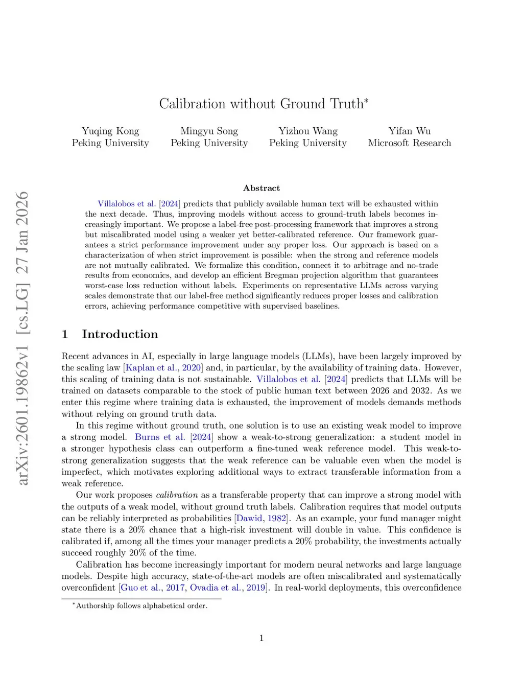 Villalobos et al. [2024] predict that publicly available human text will be exhausted within the next decade. Thus, improving models without access to ground-truth labels becomes increasingly important. We propose a label-free post-processing framework that improves a strong but miscalibrated model using a weaker yet better-calibrated reference. Our framework guarantees a strict performance improvement under any proper loss. Our approach is based on a characterization of when strict improvement is possible: when the strong and reference models are not mutually calibrated. We formalize this condition, connect it to arbitrage and no-trade results from economics, and develop an efficient Bregman projection algorithm that guarantees worst-case loss reduction without labels. Experiments on representative LLMs across varying scales demonstrate that our label-free method significantly reduces proper losses and calibration errors, achieving performance competitive with supervised baselines.