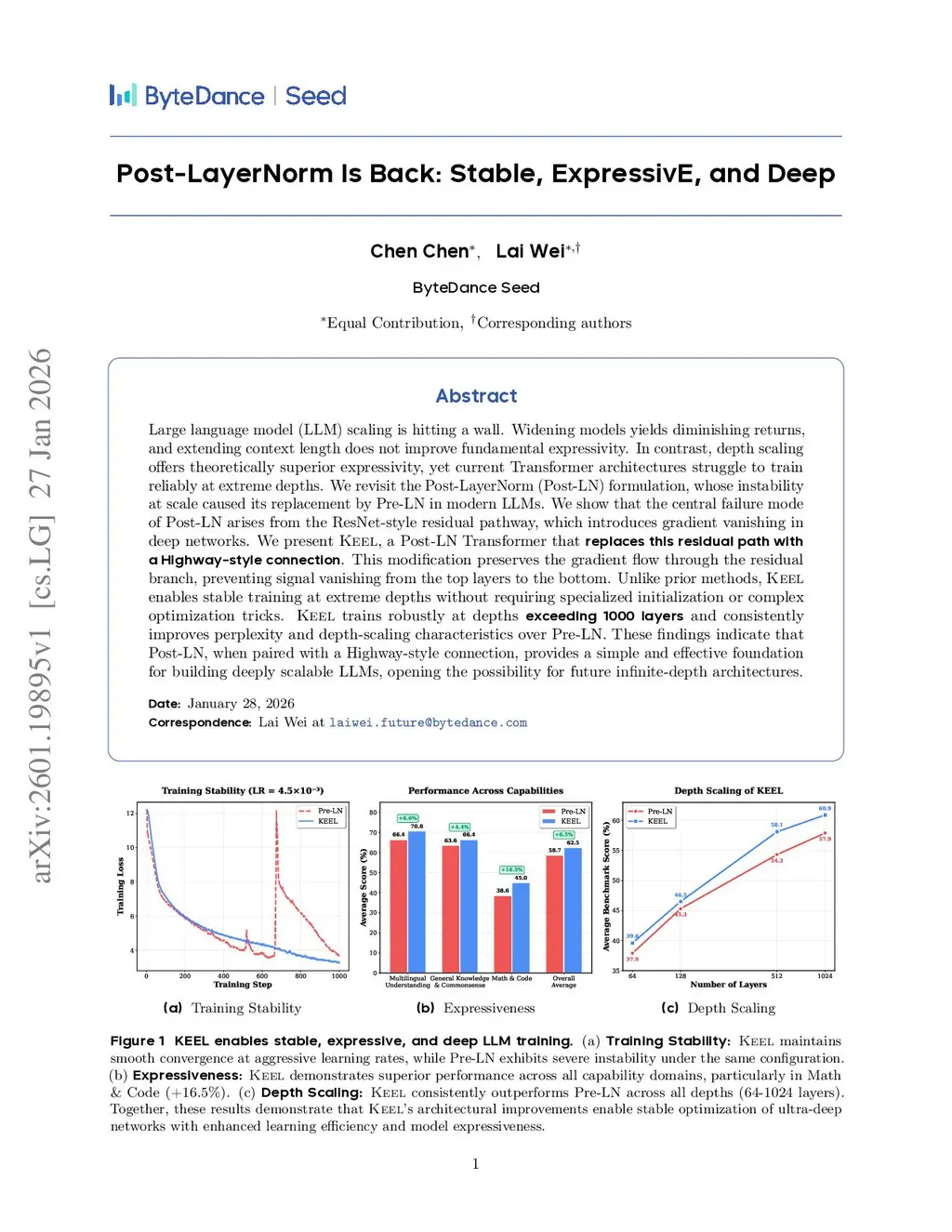Large language model (LLM) scaling is hitting a wall. Widening models yields diminishing returns, and extending context length does not improve fundamental expressivity. In contrast, depth scaling offers theoretically superior expressivity, yet current Transformer architectures struggle to train reliably at extreme depths. We revisit the Post-LayerNorm (Post-LN) formulation, whose instability at scale caused its replacement by Pre-LN in modern LLMs. We show that the central failure mode of Post-LN arises from the ResNet-style residual pathway, which introduces gradient vanishing in deep networks. We present Keel, a Post-LN Transformer that replaces this residual path with a Highway-style connection. This modification preserves the gradient flow through the residual branch, preventing signal vanishing from the top layers to the bottom. Unlike prior methods, Keel enables stable training at extreme depths without requiring specialized initialization or complex optimization tricks. Keel trains robustly at depths exceeding 1000 layers and consistently improves perplexity and depth-scaling characteristics over Pre-LN. These findings indicate that Post-LN, when paired with a Highway-style connection, provides a simple and effective foundation for building deeply scalable LLMs, opening the possibility for future infinite-depth architectures.