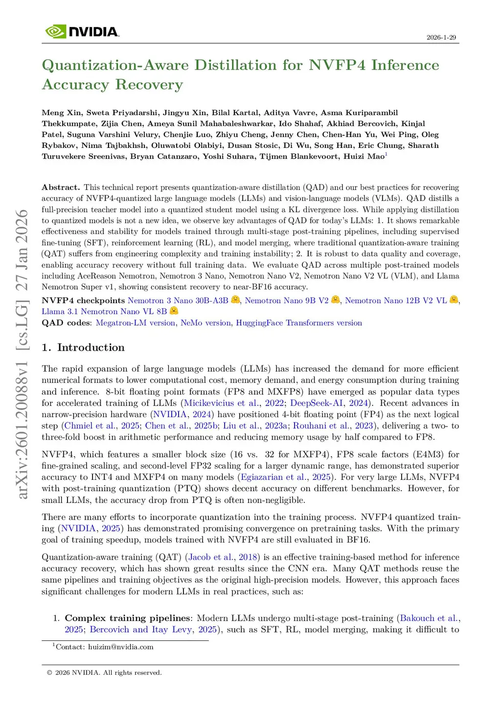 This technical report presents quantization-aware distillation (QAD) and our best practices for recovering accuracy of NVFP4-quantized large language models (LLMs) and vision-language models (VLMs). QAD distills a full-precision teacher model into a quantized student model using a KL divergence loss. While applying distillation to quantized models is not a new idea, we observe key advantages of QAD for today's LLMs: 1. It shows remarkable effectiveness and stability for models trained through multi-stage post-training pipelines, including supervised fine-tuning (SFT), reinforcement learning (RL), and model merging, where traditional quantization-aware training (QAT) suffers from engineering complexity and training instability; 2. It is robust to data quality and coverage, enabling accuracy recovery without full training data. We evaluate QAD across multiple post-trained models including AceReason Nemotron, Nemotron 3 Nano, Nemotron Nano V2, Nemotron Nano V2 VL (VLM), and Llama Nemotron Super v1, showing consistent recovery to near-BF16 accuracy.