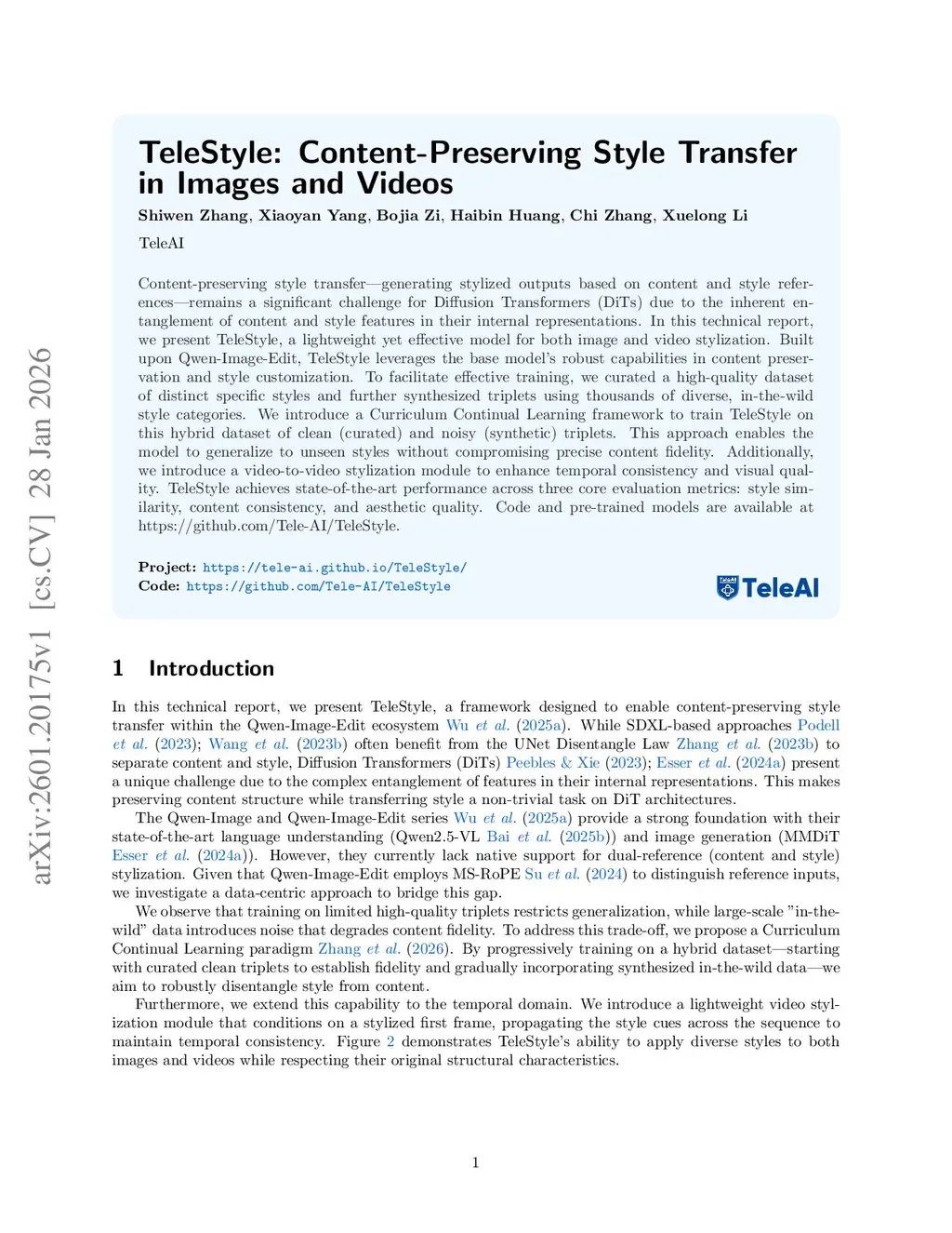 Content-preserving style transfer, generating stylized outputs based on content and style references, remains a significant challenge for Diffusion Transformers (DiTs) due to the inherent entanglement of content and style features in their internal representations. In this technical report, we present TeleStyle, a lightweight yet effective model for both image and video stylization. Built upon Qwen-Image-Edit, TeleStyle leverages the base model's robust capabilities in content preservation and style customization. To facilitate effective training, we curated a high-quality dataset of distinct specific styles and further synthesized triplets using thousands of diverse, in-the-wild style categories. We introduce a Curriculum Continual Learning framework to train TeleStyle on this hybrid dataset of clean (curated) and noisy (synthetic) triplets. This approach enables the model to generalize to unseen styles without compromising precise content fidelity. Additionally, we introduce a video-to-video stylization module to enhance temporal consistency and visual quality. TeleStyle achieves state-of-the-art performance across three core evaluation metrics: style similarity, content consistency, and aesthetic quality. Code and pre-trained models are available atthis https URL