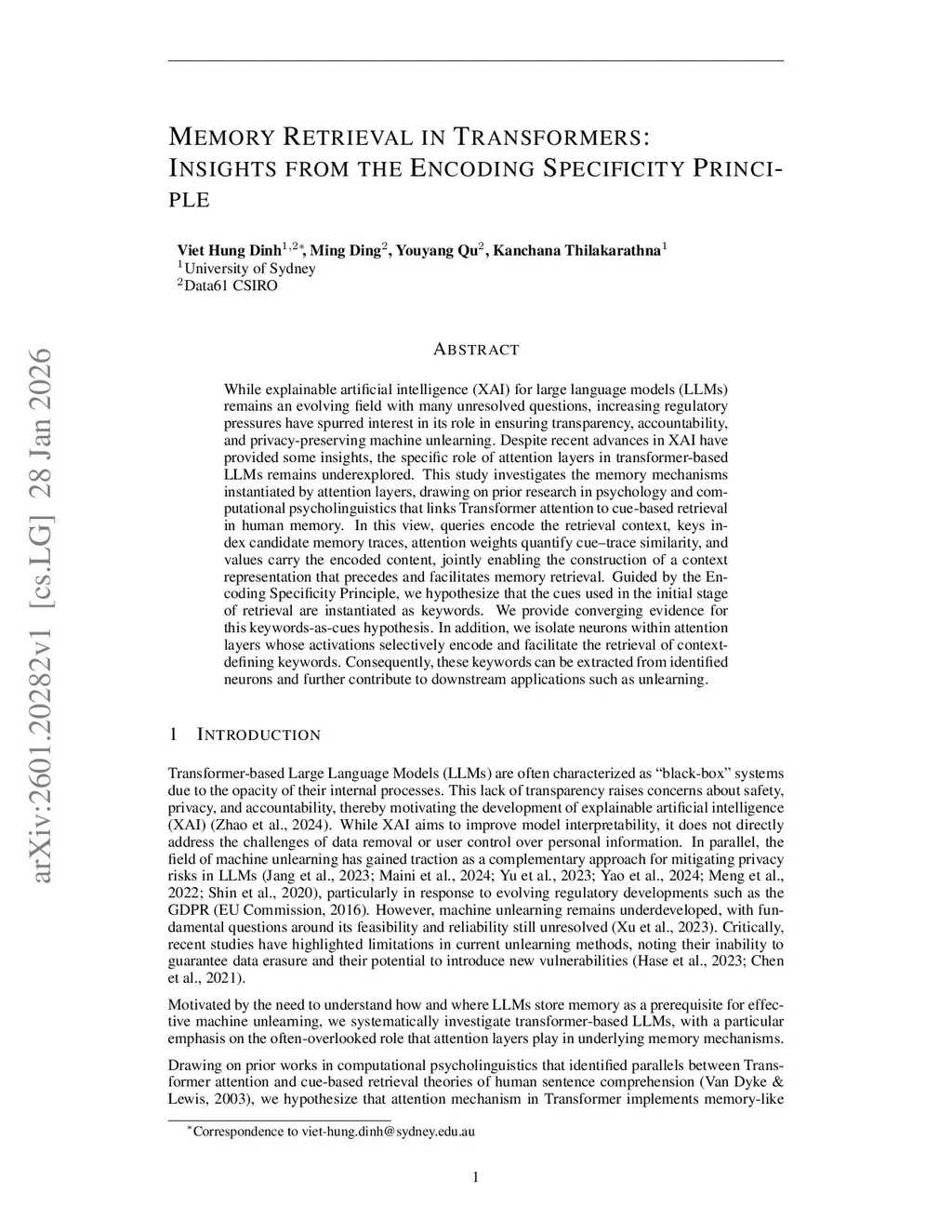 While explainable artificial intelligence (XAI) for large language models (LLMs) remains an evolving field with many unresolved questions, increasing regulatory pressures have spurred interest in its role in ensuring transparency, accountability, and privacy-preserving machine unlearning. Despite recent advances in XAI have provided some insights, the specific role of attention layers in transformer based LLMs remains underexplored. This study investigates the memory mechanisms instantiated by attention layers, drawing on prior research in psychology and computational psycholinguistics that links Transformer attention to cue based retrieval in human memory. In this view, queries encode the retrieval context, keys index candidate memory traces, attention weights quantify cue trace similarity, and values carry the encoded content, jointly enabling the construction of a context representation that precedes and facilitates memory retrieval. Guided by the Encoding Specificity Principle, we hypothesize that the cues used in the initial stage of retrieval are instantiated as keywords. We provide converging evidence for this keywords-as-cues hypothesis. In addition, we isolate neurons within attention layers whose activations selectively encode and facilitate the retrieval of context-defining keywords. Consequently, these keywords can be extracted from identified neurons and further contribute to downstream applications such as unlearning.