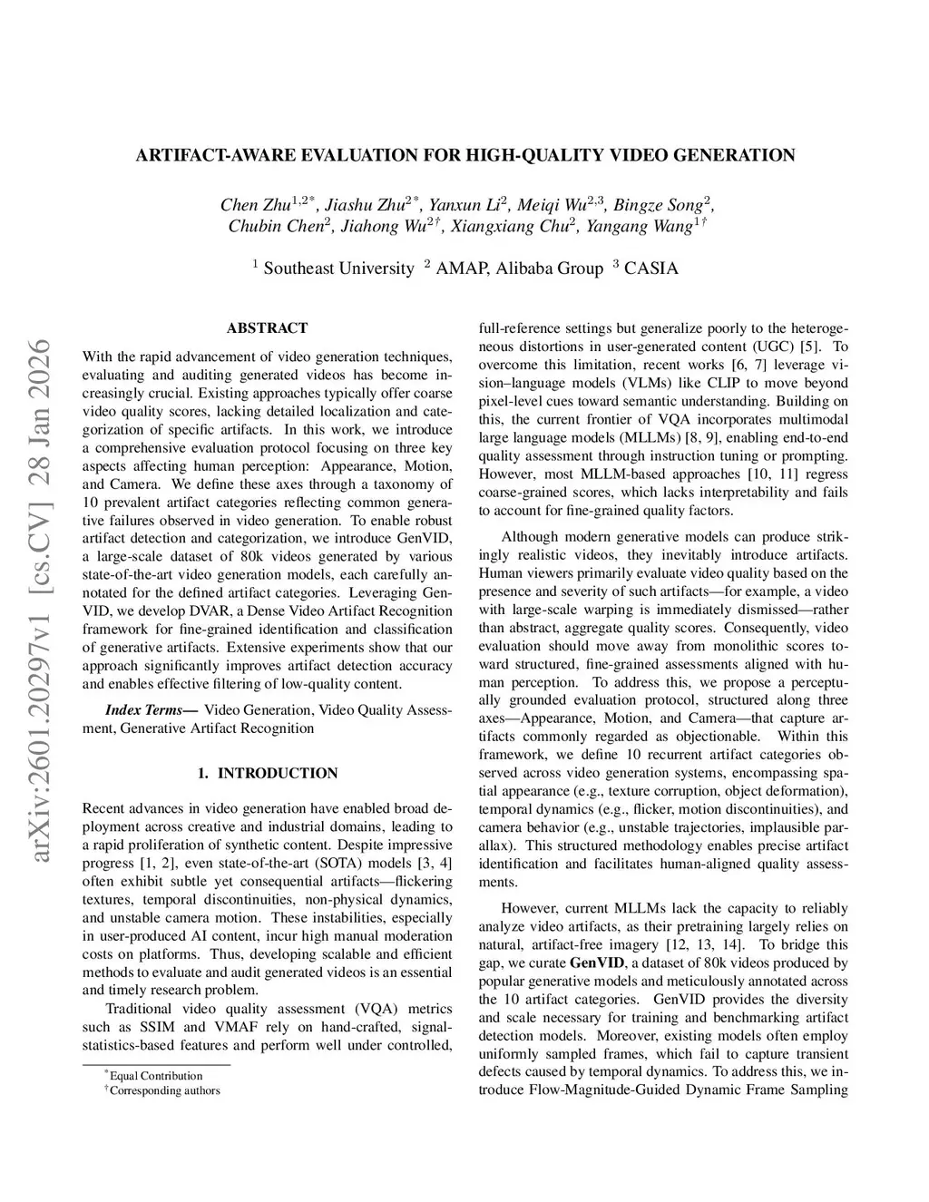 With the rapid advancement of video generation techniques, evaluating and auditing generated videos has become increasingly crucial. Existing approaches typically offer coarse video quality scores, lacking detailed localization and categorization of specific artifacts. In this work, we introduce a comprehensive evaluation protocol focusing on three key aspects affecting human perception: Appearance, Motion, and Camera. We define these axes through a taxonomy of 10 prevalent artifact categories reflecting common generative failures observed in video generation. To enable robust artifact detection and categorization, we introduce GenVID, a large-scale dataset of 80k videos generated by various state-of-the-art video generation models, each carefully annotated for the defined artifact categories. Leveraging GenVID, we develop DVAR, a Dense Video Artifact Recognition framework for fine-grained identification and classification of generative artifacts. Extensive experiments show that our approach significantly improves artifact detection accuracy and enables effective filtering of low-quality content.