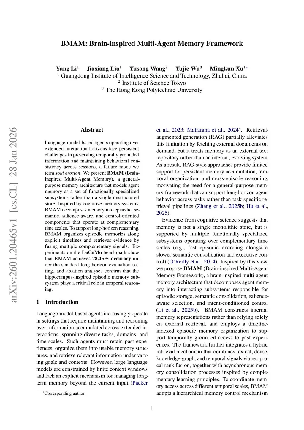 Language-model-based agents operating over extended interaction horizons face persistent challenges in preserving temporally grounded information and maintaining behavioral consistency across sessions, a failure mode we term soul erosion. We present BMAM (Brain-inspired Multi-Agent Memory), a general-purpose memory architecture that models agent memory as a set of functionally specialized subsystems rather than a single unstructured store. Inspired by cognitive memory systems, BMAM decomposes memory into episodic, semantic, salience-aware, and control-oriented components that operate at complementary time scales. To support long-horizon reasoning, BMAM organizes episodic memories along explicit timelines and retrieves evidence by fusing multiple complementary signals. Experiments on the LoCoMo benchmark show that BMAM achieves 78.45 percent accuracy under the standard long-horizon evaluation setting, and ablation analyses confirm that the hippocampus-inspired episodic memory subsystem plays a critical role in temporal reasoning.