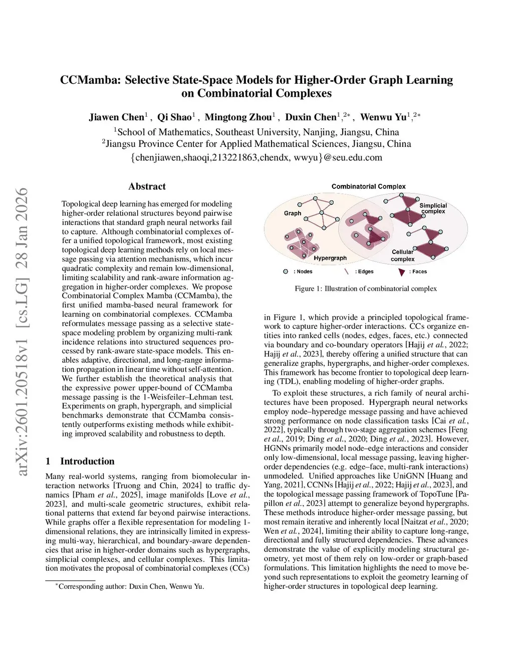 Topological deep learning has emerged for modeling higher-order relational structures beyond pairwise interactions that standard graph neural networks fail to capture. Although combinatorial complexes offer a unified topological framework, most existing topological deep learning methods rely on local message passing via attention mechanisms, which incur quadratic complexity and remain low-dimensional, limiting scalability and rank-aware information aggregation in higher-orderthis http URLpropose Combinatorial Complex Mamba (CCMamba), the first unified mamba-based neural framework for learning on combinatorial complexes. CCMamba reformulates message passing as a selective state-space modeling problem by organizing multi-rank incidence relations into structured sequences processed by rank-aware state-space models. This enables adaptive, directional, and long range information propagation in linear time without self attention. We further establish the theoretical analysis that the expressive power upper-bound of CCMamba message passing is the 1-Weisfeiler-Lehman test. Experiments on graph, hypergraph, and simplicial benchmarks demonstrate that CCMamba consistently outperforms existing methods while exhibiting improved scalability and robustness to depth.