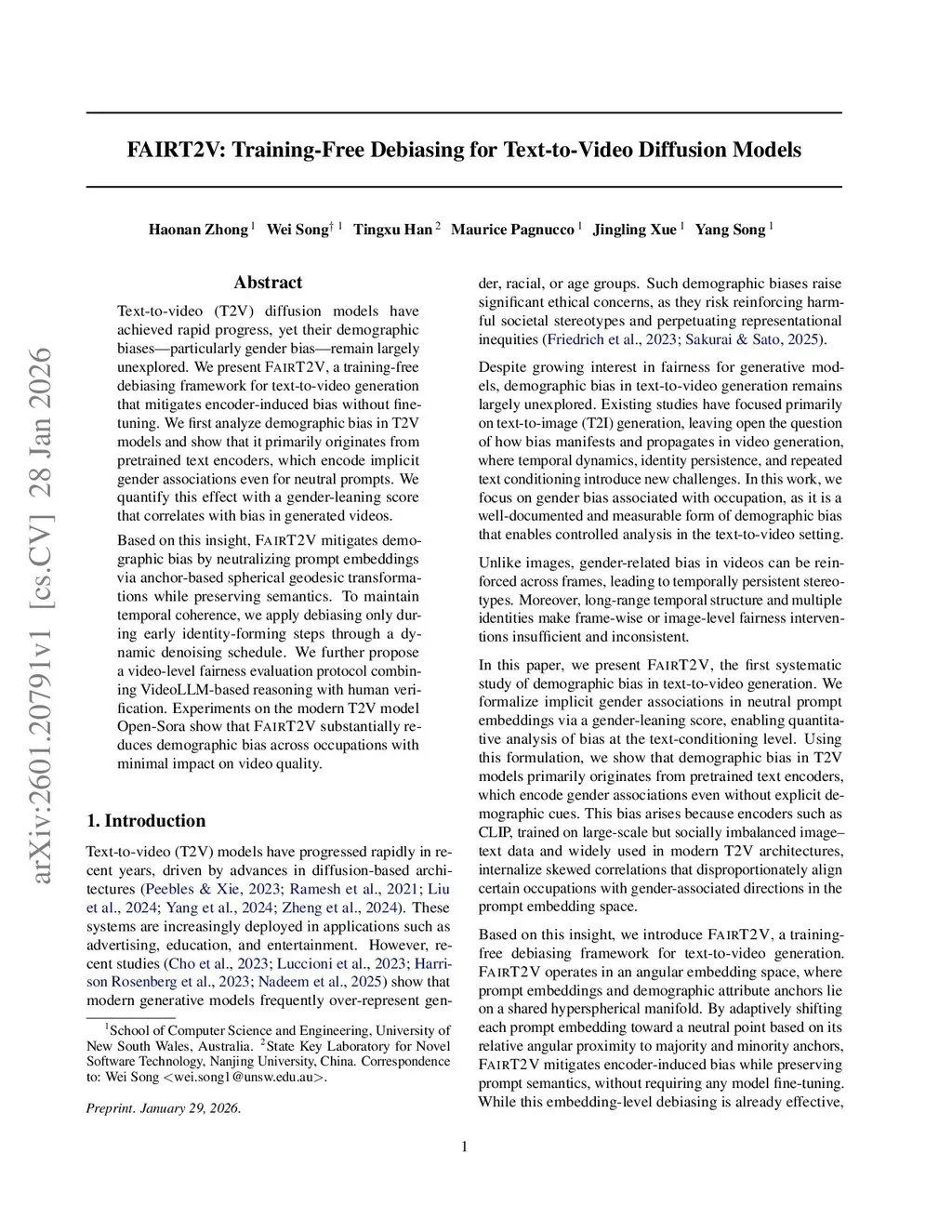 FAIRT2V: Training-Free Debiasing for Text-to-Video Diffusion Models