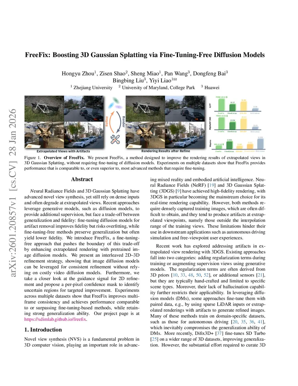 Neural Radiance Fields and 3D Gaussian Splatting have advanced novel view synthesis, yet still rely on dense inputs and often degrade at extrapolated views. Recent approaches leverage generative models, such as diffusion models, to provide additional supervision, but face a trade-off between generalization and fidelity: fine-tuning diffusion models for artifact removal improves fidelity but risks overfitting, while fine-tuning-free methods preserve generalization but often yield lower fidelity. We introduce FreeFix, a fine-tuning-free approach that pushes the boundary of this trade-off by enhancing extrapolated rendering with pretrained image diffusion models. We present an interleaved 2D-3D refinement strategy, showing that image diffusion models can be leveraged for consistent refinement without relying on costly video diffusion models. Furthermore, we take a closer look at the guidance signal for 2D refinement and propose a per-pixel confidence mask to identify uncertain regions for targeted improvement. Experiments across multiple datasets show that FreeFix improves multi-frame consistency and achieves performance comparable to or surpassing fine-tuning-based methods, while retaining strong generalization ability.