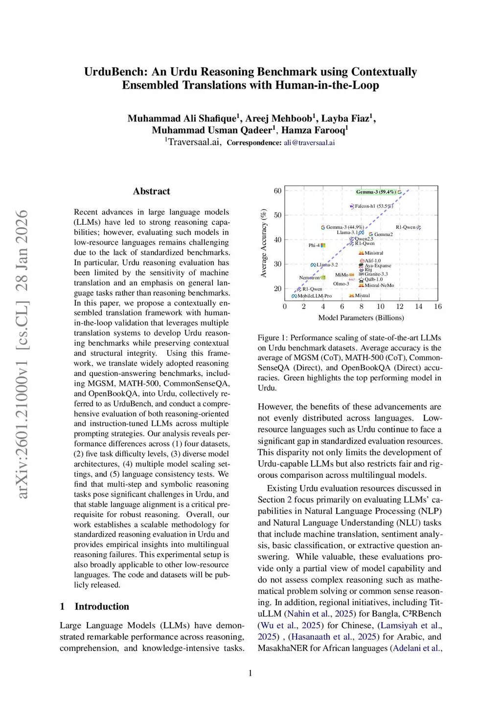 Recent advances in large language models (LLMs) have led to strong reasoning capabilities; however, evaluating such models in low-resource languages remains challenging due to the lack of standardized benchmarks. In particular, Urdu reasoning evaluation has been limited by the sensitivity of machine translation and an emphasis on general language tasks rather than reasoning benchmarks. In this paper, we propose a contextually ensembled translation framework with human-in-the-loop validation that leverages multiple translation systems to develop Urdu reasoning benchmarks while preserving contextual and structural integrity. Using this framework, we translate widely adopted reasoning and question-answering benchmarks, including MGSM, MATH-500, CommonSenseQA, and OpenBookQA, into Urdu, collectively referred to as UrduBench, and conduct a comprehensive evaluation of both reasoning-oriented and instruction-tuned LLMs across multiple prompting strategies. Our analysis reveals performance differences across (1) four datasets, (2) five task difficulty levels, (3) diverse model architectures, (4) multiple model scaling settings, and (5) language consistency tests. We find that multi-step and symbolic reasoning tasks pose significant challenges in Urdu, and that stable language alignment is a critical prerequisite for robust reasoning. Overall, our work establishes a scalable methodology for standardized reasoning evaluation in Urdu and provides empirical insights into multilingual reasoning failures. This experimental setup is also broadly applicable to other low-resource languages. The code and datasets will be publicly released.