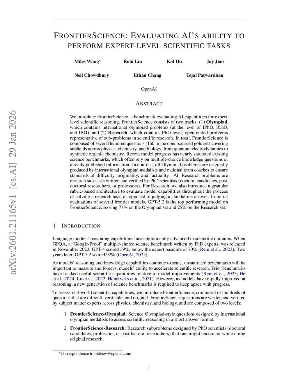 We introduce FrontierScience, a benchmark evaluating expert-level scientific reasoning in frontier language models. Recent model progress has nearly saturated existing science benchmarks, which often rely on multiple-choice knowledge questions or already published information. FrontierScience addresses this gap through two complementary tracks: (1) Olympiad, consisting of international olympiad problems at the level of IPhO, IChO, and IBO, and (2) Research, consisting of PhD-level, open-ended problems representative of sub-tasks in scientific research.FrontierScience contains several hundred questions (including 160 in the open-sourced gold set) covering subfields across physics, chemistry, and biology, from quantum electrodynamics to synthetic organic chemistry. All Olympiad problems are originally produced by international Olympiad medalists and national team coaches to ensure standards of difficulty, originality, and factuality. All Research problems are research sub-tasks written and verified by PhD scientists (doctoral candidates, postdoctoral researchers, or professors). For Research, we introduce a granular rubric-based evaluation framework to assess model capabilities throughout the process of solving a research task, rather than judging only a standalone final answer.