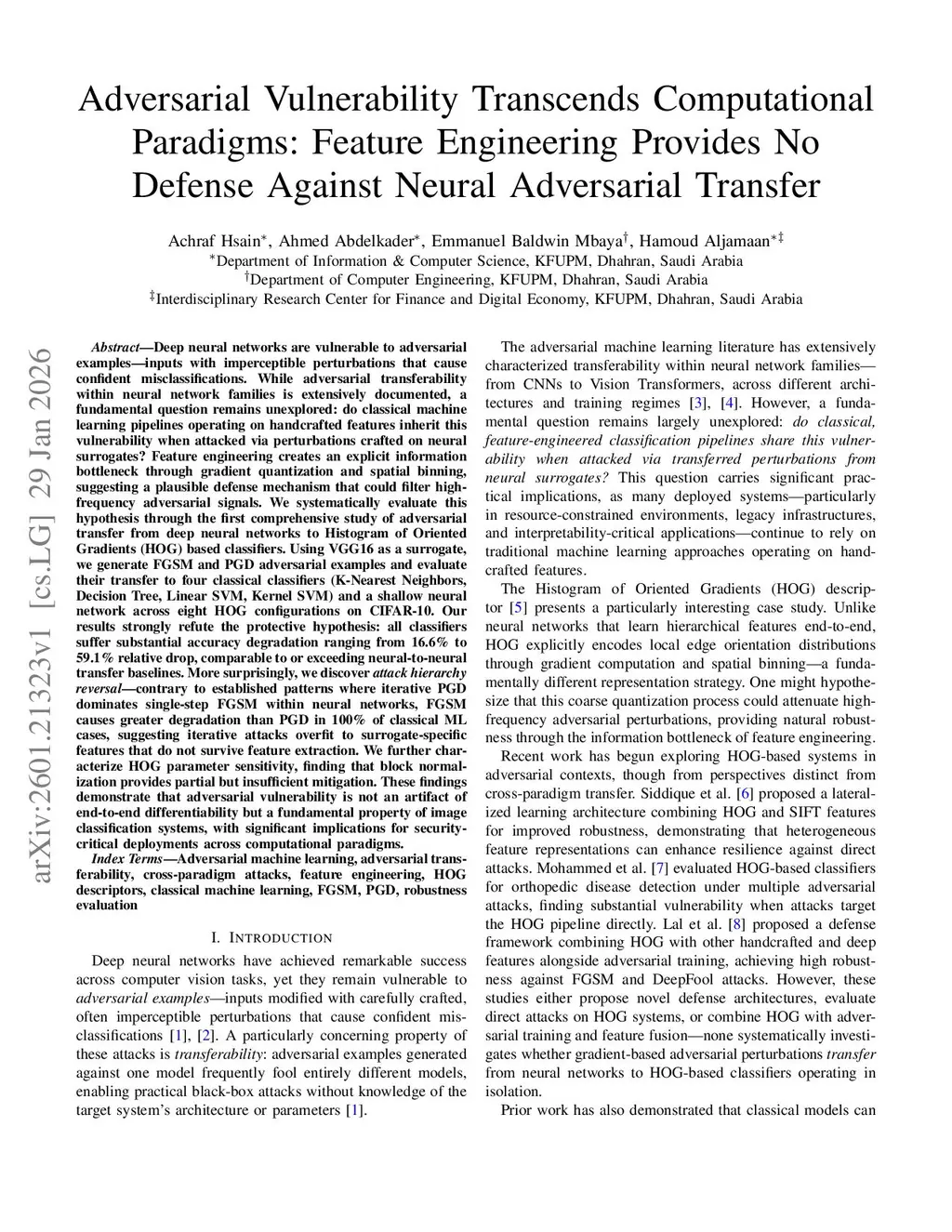 Deep neural networks are vulnerable to adversarial examples--inputs with imperceptible perturbations causing misclassification. While adversarial transfer within neural networks is well-documented, whether classical ML pipelines using handcrafted features inherit this vulnerability when attacked via neural surrogates remains unexplored. Feature engineering creates information bottlenecks through gradient quantization and spatial binning, potentially filtering high-frequency adversarial signals. We evaluate this hypothesis through the first comprehensive study of adversarial transfer from DNNs to HOG-based classifiers. Using VGG16 as a surrogate, we generate FGSM and PGD adversarial examples and test transfer to four classical classifiers (KNN, Decision Tree, Linear SVM, Kernel SVM) and a shallow neural network across eight HOG configurations on CIFAR-10. Our results strongly refute the protective hypothesis: all classifiers suffer 16.6%-59.1% relative accuracy drops, comparable to neural-to-neural transfer. More surprisingly, we discover attack hierarchy reversal--contrary to patterns where iterative PGD dominates FGSM within neural networks, FGSM causes greater degradation than PGD in 100% of classical ML cases, suggesting iterative attacks overfit to surrogate-specific features that don't survive feature extraction. Block normalization provides partial but insufficient mitigation. These findings demonstrate that adversarial vulnerability is not an artifact of end-to-end differentiability but a fundamental property of image classification systems, with implications for security-critical deployments across computational paradigms.