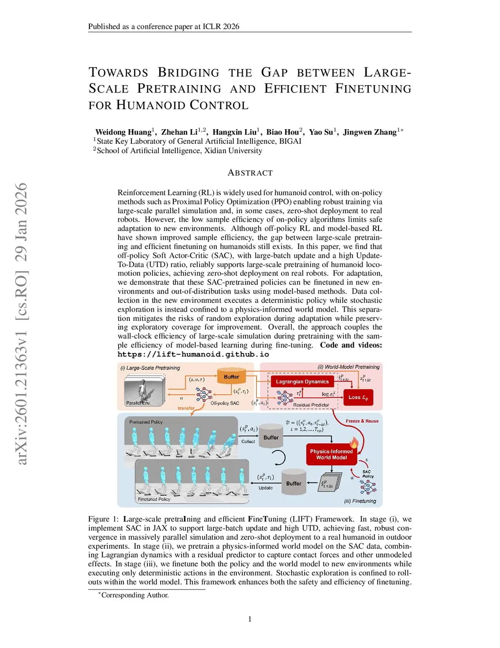 Reinforcement learning (RL) is widely used for humanoid control, with on-policy methods such as Proximal Policy Optimization (PPO) enabling robust training via large-scale parallel simulation and, in some cases, zero-shot deployment to real robots. However, the low sample efficiency of on-policy algorithms limits safe adaptation to new environments. Although off-policy RL and model-based RL have shown improved sample efficiency, the gap between large-scale pretraining and efficient finetuning on humanoids still exists. In this paper, we find that off-policy Soft Actor-Critic (SAC), with large-batch update and a high Update-To-Data (UTD) ratio, reliably supports large-scale pretraining of humanoid locomotion policies, achieving zero-shot deployment on real robots. For adaptation, we demonstrate that these SAC-pretrained policies can be finetuned in new environments and out-of-distribution tasks using model-based methods. Data collection in the new environment executes a deterministic policy while stochastic exploration is instead confined to a physics-informed world model. This separation mitigates the risks of random exploration during adaptation while preserving exploratory coverage for improvement. Overall, the approach couples the wall-clock efficiency of large-scale simulation during pretraining with the sample efficiency of model-based learning during fine-tuning.