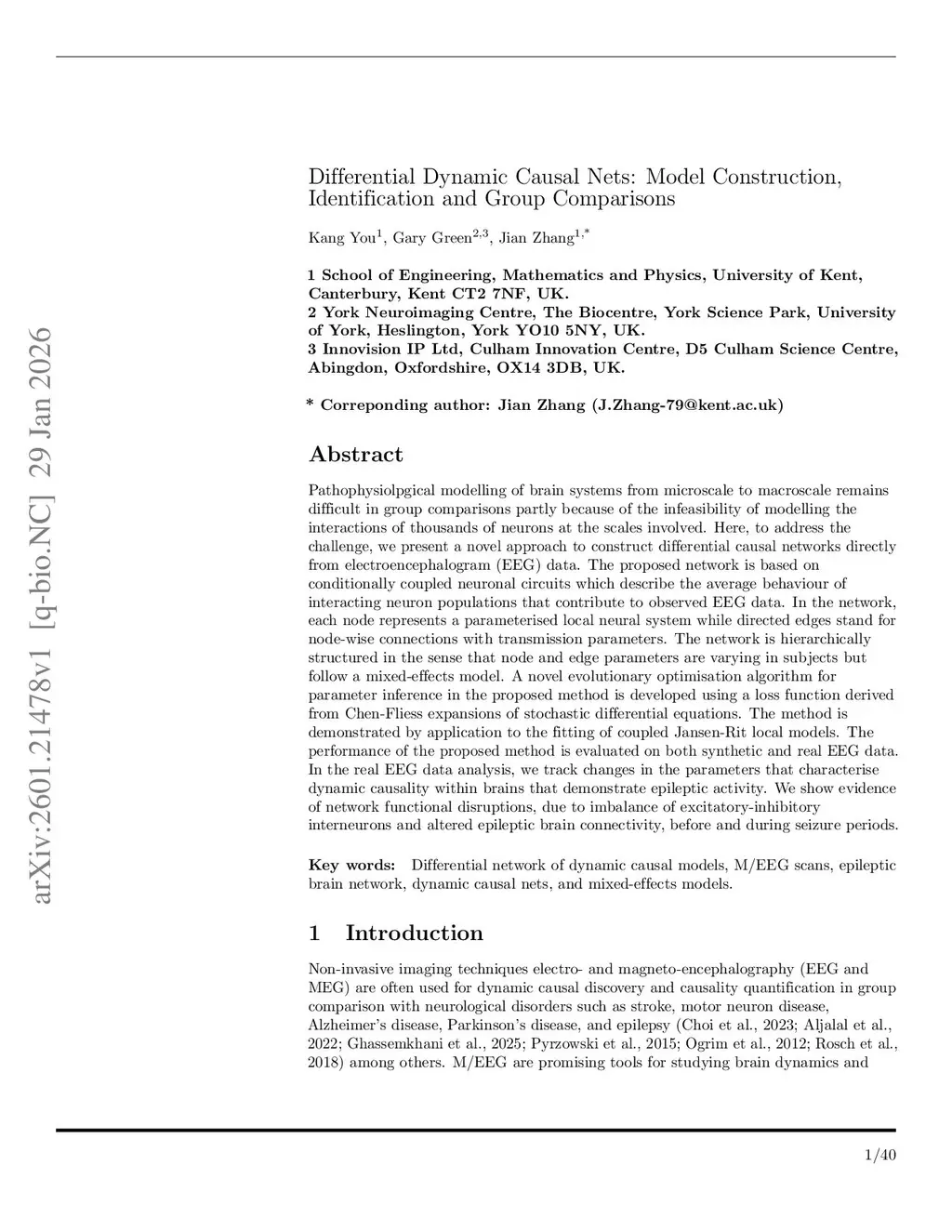 Pathophysiolpgical modelling of brain systems from microscale to macroscale remains difficult in group comparisons partly because of the infeasibility of modelling the interactions of thousands of neurons at the scales involved. Here, to address the challenge, we present a novel approach to construct differential causal networks directly from electroencephalogram (EEG) data. The proposed network is based on conditionally coupled neuronal circuits which describe the average behaviour of interacting neuron populations that contribute to observed EEG data. In the network, each node represents a parameterised local neural system while directed edges stand for node-wise connections with transmission parameters. The network is hierarchically structured in the sense that node and edge parameters are varying in subjects but follow a mixed-effects model. A novel evolutionary optimisation algorithm for parameter inference in the proposed method is developed using a loss function derived from Chen-Fliess expansions of stochastic differential equations. The method is demonstrated by application to the fitting of coupled Jansen-Rit local models. The performance of the proposed method is evaluated on both synthetic and real EEG data. In the real EEG data analysis, we track changes in the parameters that characterise dynamic causality within brains that demonstrate epileptic activity. We show evidence of network functional disruptions, due to imbalance of excitatory-inhibitory interneurons and altered epileptic brain connectivity, before and during seizure periods.