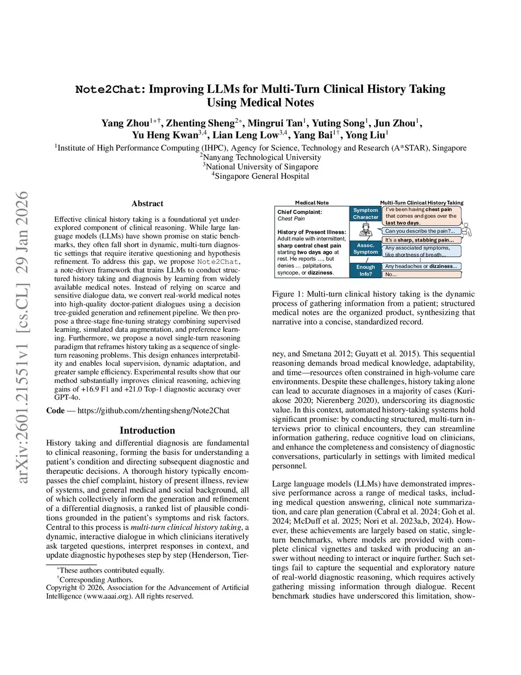 Effective clinical history taking is a foundational yet underexplored component of clinical reasoning. While large language models (LLMs) have shown promise on static benchmarks, they often fall short in dynamic, multi-turn diagnostic settings that require iterative questioning and hypothesis refinement. To address this gap, we propose \method{}, a note-driven framework that trains LLMs to conduct structured history taking and diagnosis by learning from widely available medical notes. Instead of relying on scarce and sensitive dialogue data, we convert real-world medical notes into high-quality doctor-patient dialogues using a decision tree-guided generation and refinement pipeline. We then propose a three-stage fine-tuning strategy combining supervised learning, simulated data augmentation, and preference learning. Furthermore, we propose a novel single-turn reasoning paradigm that reframes history taking as a sequence of single-turn reasoning problems. This design enhances interpretability and enables local supervision, dynamic adaptation, and greater sample efficiency. Experimental results show that our method substantially improves clinical reasoning, achieving gains of +16.9 F1 and +21.0 Top-1 diagnostic accuracy over GPT-4o. Our code and dataset can be found atthis https URL.