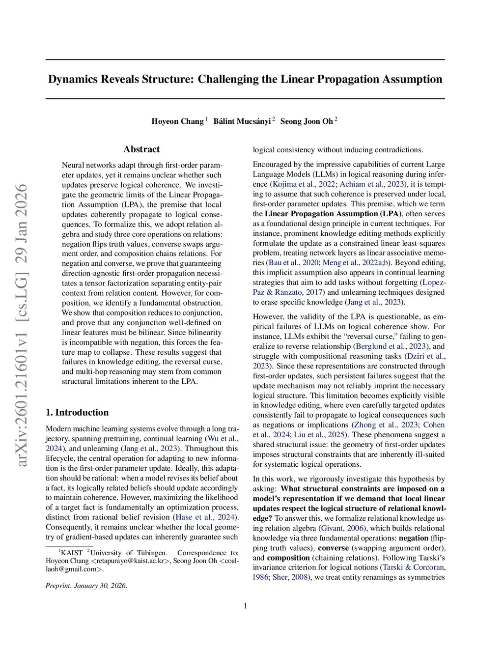 Neural networks adapt through first-order parameter updates, yet it remains unclear whether such updates preserve logical coherence. We investigate the geometric limits of the Linear Propagation Assumption (LPA), the premise that local updates coherently propagate to logical consequences. To formalize this, we adopt relation algebra and study three core operations on relations: negation flips truth values, converse swaps argument order, and composition chains relations. For negation and converse, we prove that guaranteeing direction-agnostic first-order propagation necessitates a tensor factorization separating entity-pair context from relation content. However, for composition, we identify a fundamental obstruction. We show that composition reduces to conjunction, and prove that any conjunction well-defined on linear features must be bilinear. Since bilinearity is incompatible with negation, this forces the feature map to collapse. These results suggest that failures in knowledge editing, the reversal curse, and multi-hop reasoning may stem from common structural limitations inherent to the LPA.