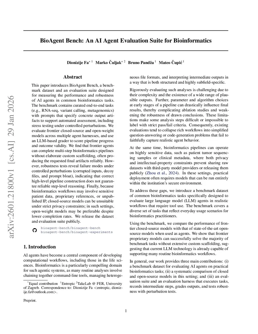 This paper introduces BioAgent Bench, a benchmark dataset and an evaluation suite designed for measuring the performance and robustness of AI agents in common bioinformatics tasks. The benchmark contains curated end-to-end tasks (e.g., RNA-seq, variant calling, metagenomics) with prompts that specify concrete output artifacts to support automated assessment, including stress testing under controlled perturbations. We evaluate frontier closed-source and open-weight models across multiple agent harnesses, and use an LLM-based grader to score pipeline progress and outcome validity. We find that frontier agents can complete multi-step bioinformatics pipelines without elaborate custom scaffolding, often producing the requested final artifacts reliably. However, robustness tests reveal failure modes under controlled perturbations (corrupted inputs, decoy files, and prompt bloat), indicating that correct high-level pipeline construction does not guarantee reliable step-level reasoning. Finally, because bioinformatics workflows may involve sensitive patient data, proprietary references, or unpublished IP, closed-source models can be unsuitable under strict privacy constraints; in such settings, open-weight models may be preferable despite lower completion rates. We release the dataset and evaluation suite publicly.
