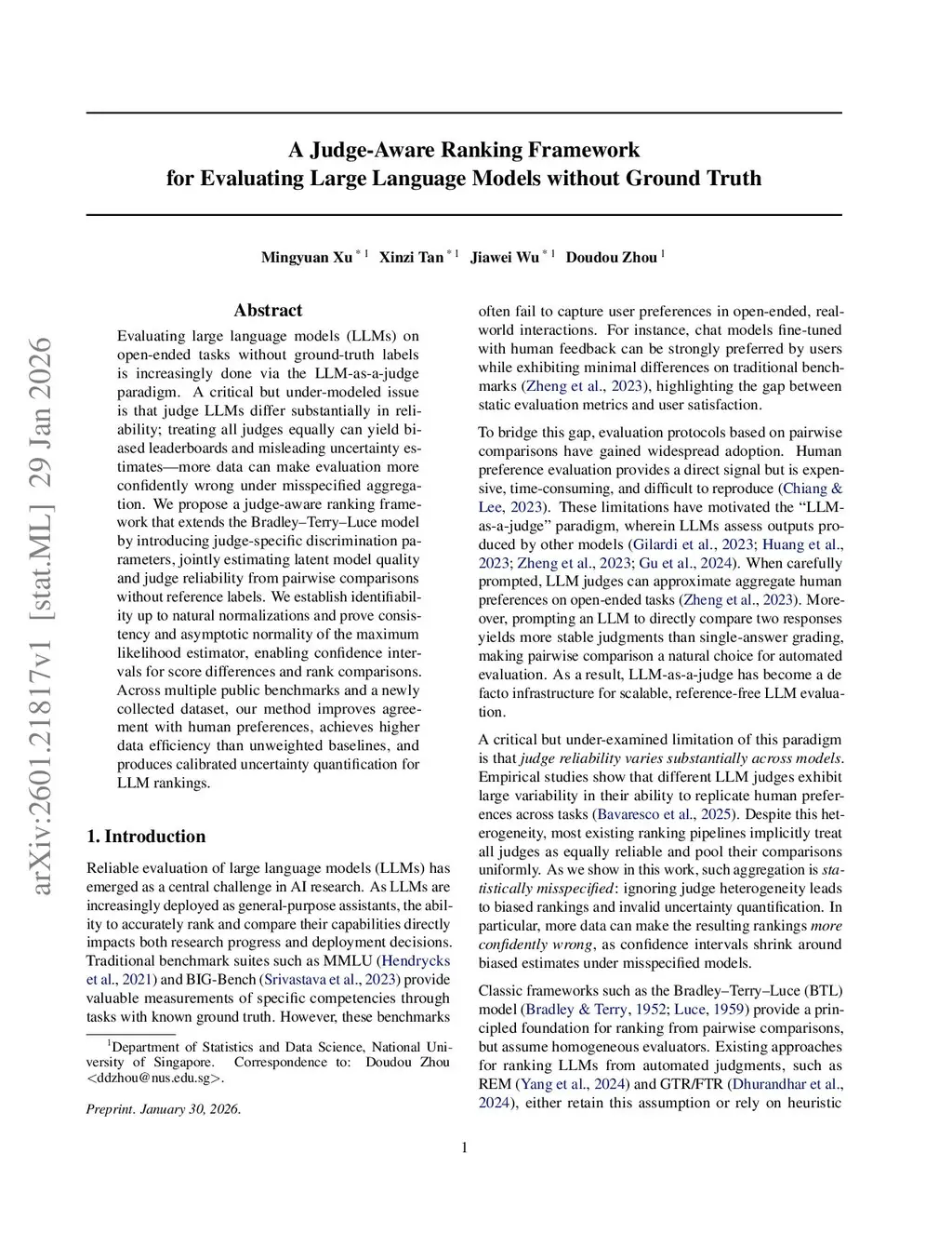 Evaluating large language models (LLMs) on open-ended tasks without ground-truth labels is increasingly done via the LLM-as-a-judge paradigm. A critical but under-modeled issue is that judge LLMs differ substantially in reliability; treating all judges equally can yield biased leaderboards and misleading uncertainty estimates. More data can make evaluation more confidently wrong under misspecified aggregation. We propose a judge-aware ranking framework that extends the Bradley-Terry-Luce model by introducing judge-specific discrimination parameters, jointly estimating latent model quality and judge reliability from pairwise comparisons without reference labels. We establish identifiability up to natural normalizations and prove consistency and asymptotic normality of the maximum likelihood estimator, enabling confidence intervals for score differences and rank comparisons. Across multiple public benchmarks and a newly collected dataset, our method improves agreement with human preferences, achieves higher data efficiency than unweighted baselines, and produces calibrated uncertainty quantification for LLM rankings.