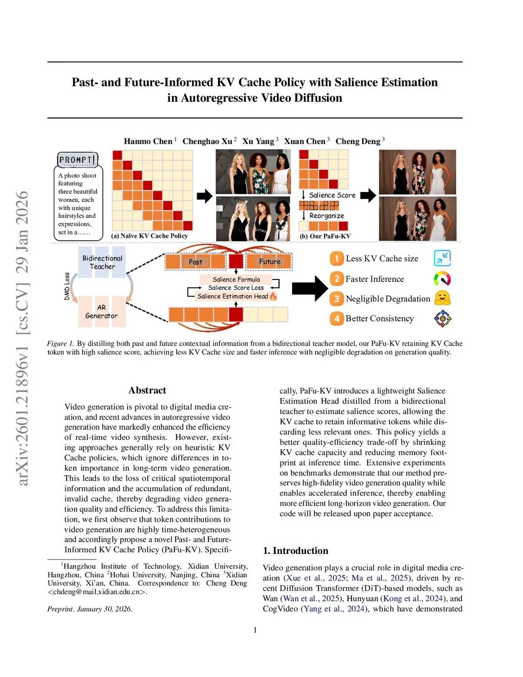 Video generation is pivotal to digital media creation, and recent advances in autoregressive video generation have markedly enhanced the efficiency of real-time video synthesis. However, existing approaches generally rely on heuristic KV Cache policies, which ignore differences in token importance in long-term video generation. This leads to the loss of critical spatiotemporal information and the accumulation of redundant, invalid cache, thereby degrading video generation quality and efficiency. To address this limitation, we first observe that token contributions to video generation are highly time-heterogeneous and accordingly propose a novel Past- and Future-Informed KV Cache Policy (PaFu-KV). Specifically, PaFu-KV introduces a lightweight Salience Estimation Head distilled from a bidirectional teacher to estimate salience scores, allowing the KV cache to retain informative tokens while discarding less relevant ones. This policy yields a better quality-efficiency trade-off by shrinking KV cache capacity and reducing memory footprint at inference time. Extensive experiments on benchmarks demonstrate that our method preserves high-fidelity video generation quality while enables accelerated inference, thereby enabling more efficient long-horizon video generation. Our code will be released upon paper acceptance.