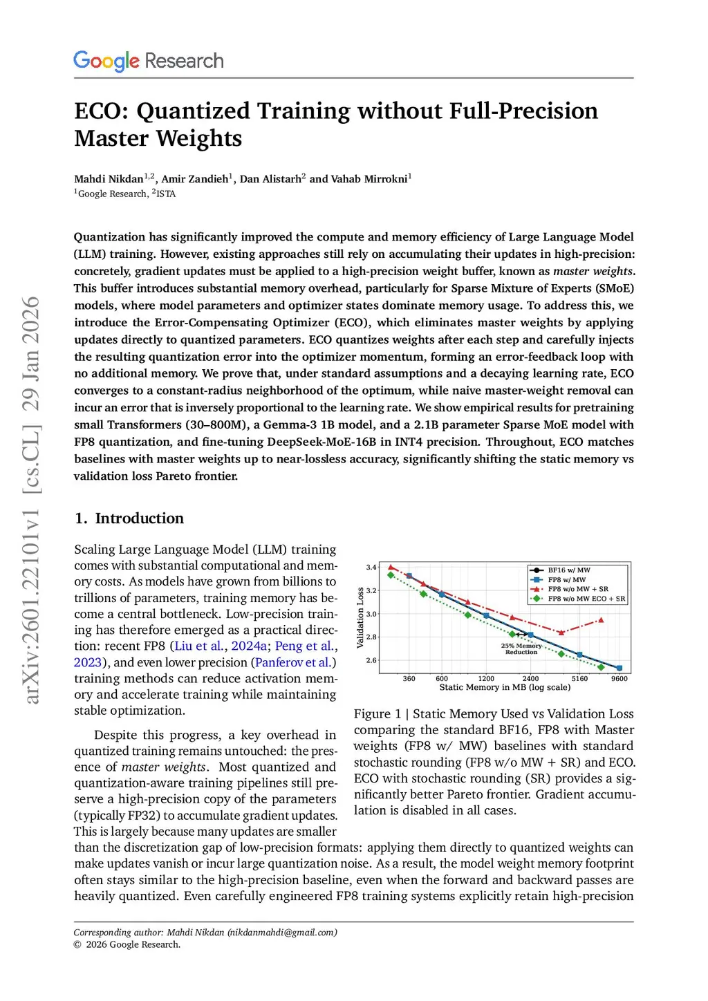 Quantization has significantly improved the compute and memory efficiency of Large Language Model (LLM) training. However, existing approaches still rely on accumulating their updates in high-precision: concretely, gradient updates must be applied to a high-precision weight buffer, known as . This buffer introduces substantial memory overhead, particularly for Sparse Mixture of Experts (SMoE) models, where model parameters and optimizer states dominate memory usage. To address this, we introduce the Error-Compensating Optimizer (ECO), which eliminates master weights by applying updates directly to quantized parameters. ECO quantizes weights after each step and carefully injects the resulting quantization error into the optimizer momentum, forming an error-feedback loop with no additional memory. We prove that, under standard assumptions and a decaying learning rate, ECO converges to a constant-radius neighborhood of the optimum, while naive master-weight removal can incur an error that is inversely proportional to the learning rate. We show empirical results for pretraining small Transformers (30-800M), a Gemma-3 1B model, and a 2.1B parameter Sparse MoE model with FP8 quantization, and fine-tuning DeepSeek-MoE-16B in INT4 precision. Throughout, ECO matches baselines with master weights up to near-lossless accuracy, significantly shifting the static memory vs validation loss Pareto frontier.