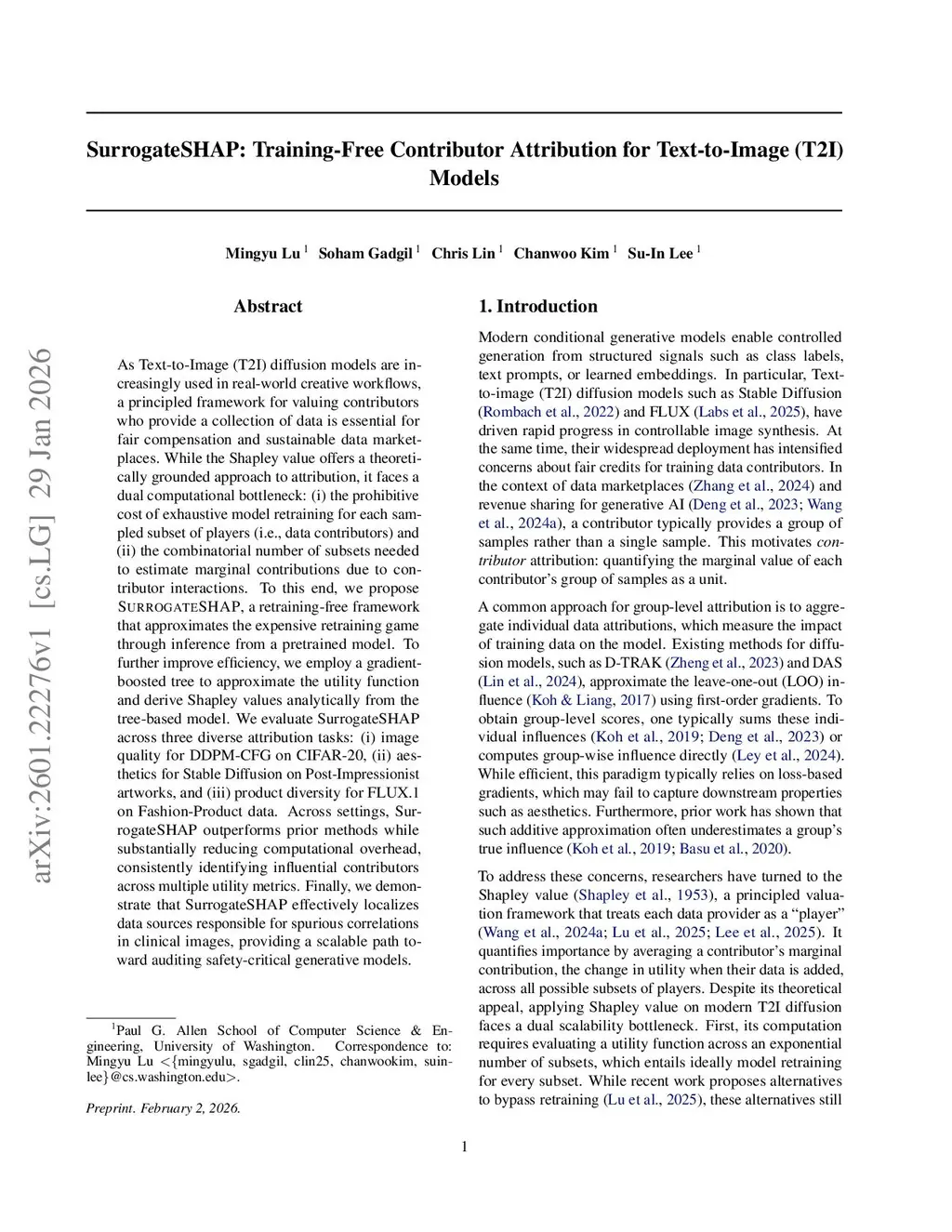 As Text-to-Image (T2I) diffusion models are increasingly used in real-world creative workflows, a principled framework for valuing contributors who provide a collection of data is essential for fair compensation and sustainable data marketplaces. While the Shapley value offers a theoretically grounded approach to attribution, it faces a dual computational bottleneck: (i) the prohibitive cost of exhaustive model retraining for each sampled subset of players (i.e., data contributors) and (ii) the combinatorial number of subsets needed to estimate marginal contributions due to contributor interactions. To this end, we propose SurrogateSHAP, a retraining-free framework that approximates the expensive retraining game through inference from a pretrained model. To further improve efficiency, we employ a gradient-boosted tree to approximate the utility function and derive Shapley values analytically from the tree-based model. We evaluate SurrogateSHAP across three diverse attribution tasks: (i) image quality for DDPM-CFG on CIFAR-20, (ii) aesthetics for Stable Diffusion on Post-Impressionist artworks, and (iii) product diversity for FLUX.1 on Fashion-Product data. Across settings, SurrogateSHAP outperforms prior methods while substantially reducing computational overhead, consistently identifying influential contributors across multiple utility metrics. Finally, we demonstrate that SurrogateSHAP effectively localizes data sources responsible for spurious correlations in clinical images, providing a scalable path toward auditing safety-critical generative models.