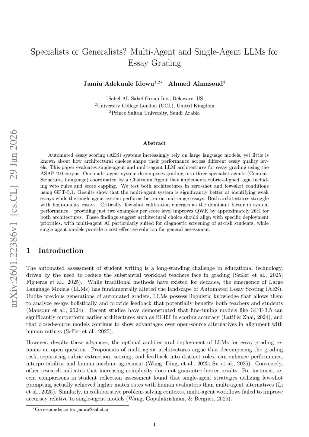 Automated essay scoring (AES) systems increasingly rely on large language models, yet little is known about how architectural choices shape their performance across different essay quality levels. This paper evaluates single-agent and multi-agent LLM architectures for essay grading using the ASAP 2.0 corpus. Our multi-agent system decomposes grading into three specialist agents (Content, Structure, Language) coordinated by a Chairman Agent that implements rubric-aligned logic including veto rules and score capping. We test both architectures in zero-shot and few-shot conditions using GPT-5.1. Results show that the multi-agent system is significantly better at identifying weak essays while the single-agent system performs better on mid-range essays. Both architectures struggle with high-quality essays. Critically, few-shot calibration emerges as the dominant factor in system performance -- providing just two examples per score level improves QWK by approximately 26% for both architectures. These findings suggest architectural choice should align with specific deployment priorities, with multi-agent AI particularly suited for diagnostic screening of at-risk students, while single-agent models provide a cost-effective solution for general assessment.