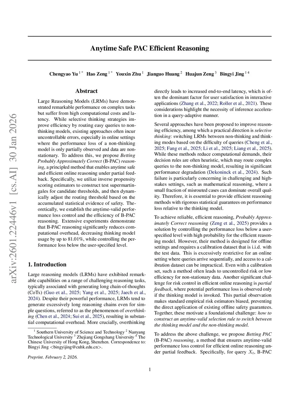 Large Reasoning Models (LRMs) have demonstrated remarkable performance on complex tasks but suffer from high computational costs and latency. While selective thinking strategies improve efficiency by routing easy queries to non-thinking models, existing approaches often incur uncontrollable errors, especially in online settings where the performance loss of a non-thinking model is only partially observed and data are non-stationary. To address this, we propose Betting Probably Approximately Correct (B-PAC) reasoning, a principled method that enables anytime safe and efficient online reasoning under partial feedback. Specifically, we utilize inverse propensity scoring estimators to construct test supermartingales for candidate thresholds, and then dynamically adjust the routing threshold based on the accumulated statistical evidence of safety. Theoretically, we establish the anytime-valid performance loss control and the efficiency of B-PAC reasoning. Extensive experiments demonstrate that B-PAC reasoning significantly reduces computational overhead, decreasing thinking model usage by up to 81.01\%, while controlling the performance loss below the user-specified level.