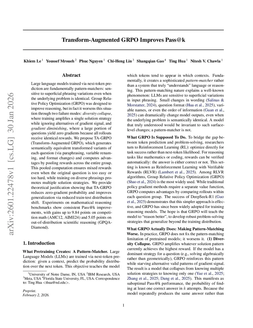 Large language models trained via next-token prediction are fundamentally pattern-matchers: sensitive to superficial phrasing variations even when the underlying problem is identical. Group Relative Policy Optimization (GRPO) was designed to improve reasoning, but in fact it worsens this situation through two failure modes: diversity collapse, where training amplifies a single solution strategy while ignoring alternatives of gradient signal, and gradient diminishing, where a large portion of questions yield zero gradients because all rollouts receive identical rewards. We propose TA-GRPO (Transform-Augmented GRPO), which generates semantically equivalent transformed variants of each question (via paraphrasing, variable renaming, and format changes) and computes advantages by pooling rewards across the entire group. This pooled computation ensures mixed rewards even when the original question is too easy or too hard, while training on diverse phrasings promotes multiple solution strategies. We provide theoretical justification showing that TA-GRPO reduces zero-gradient probability and improves generalization via reduced train-test distribution shift. Experiments on mathematical reasoning benchmarks show consistent Pass@k improvements, with gains up to 9.84 points on competition math (AMC12, AIME24) and 5.05 points on out-of-distribution scientific reasoning (GPQA-Diamond).