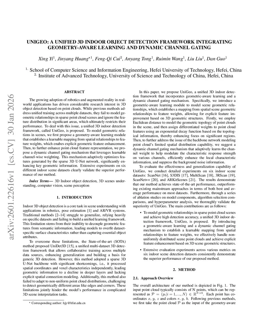 UniGeo: A Unified 3D Indoor Object Detection Framework Integrating Geometry-Aware Learning and Dynamic Channel Gating