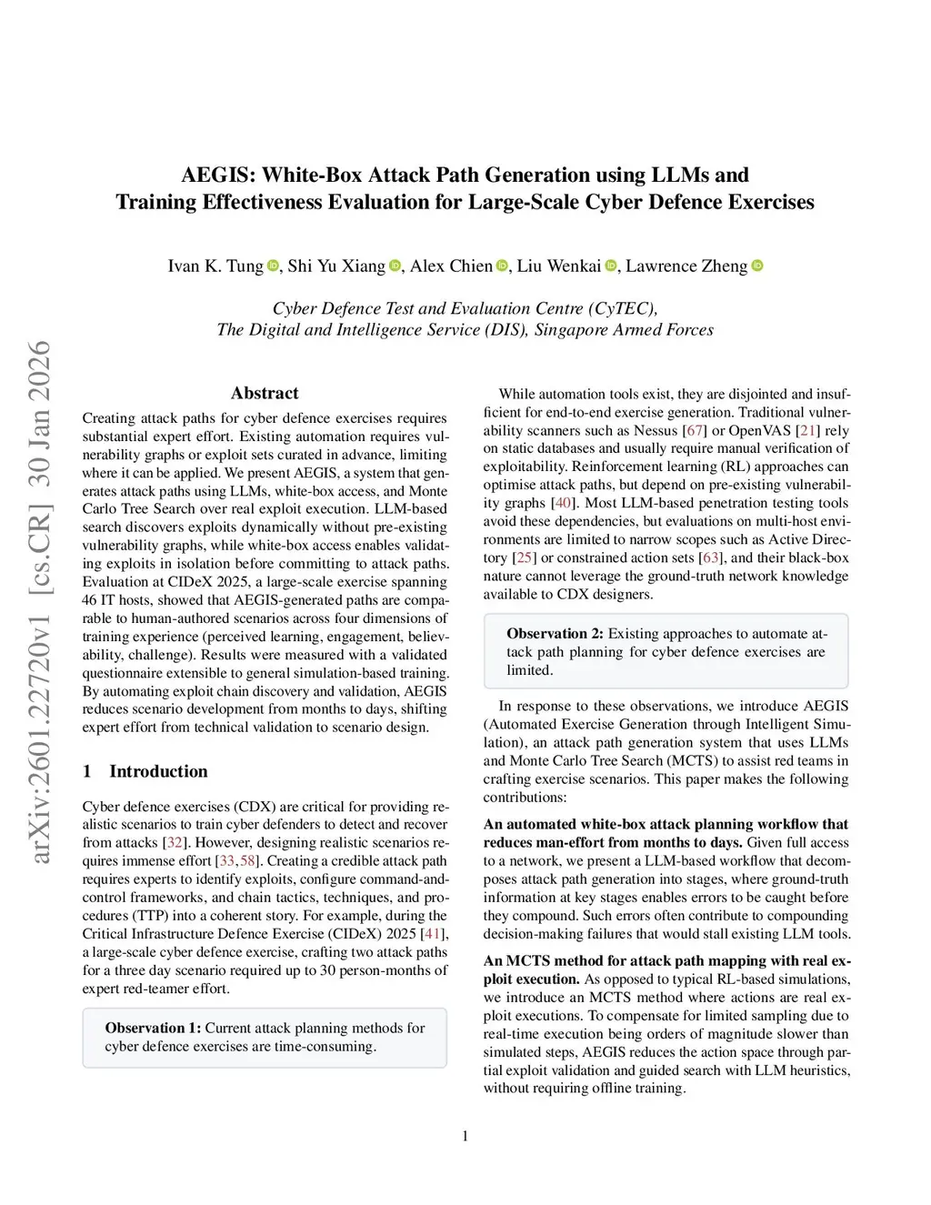 AEGIS: White-Box Attack Path Generation using LLMs and Training Effectiveness Evaluation for Large-Scale Cyber Defence Exercises