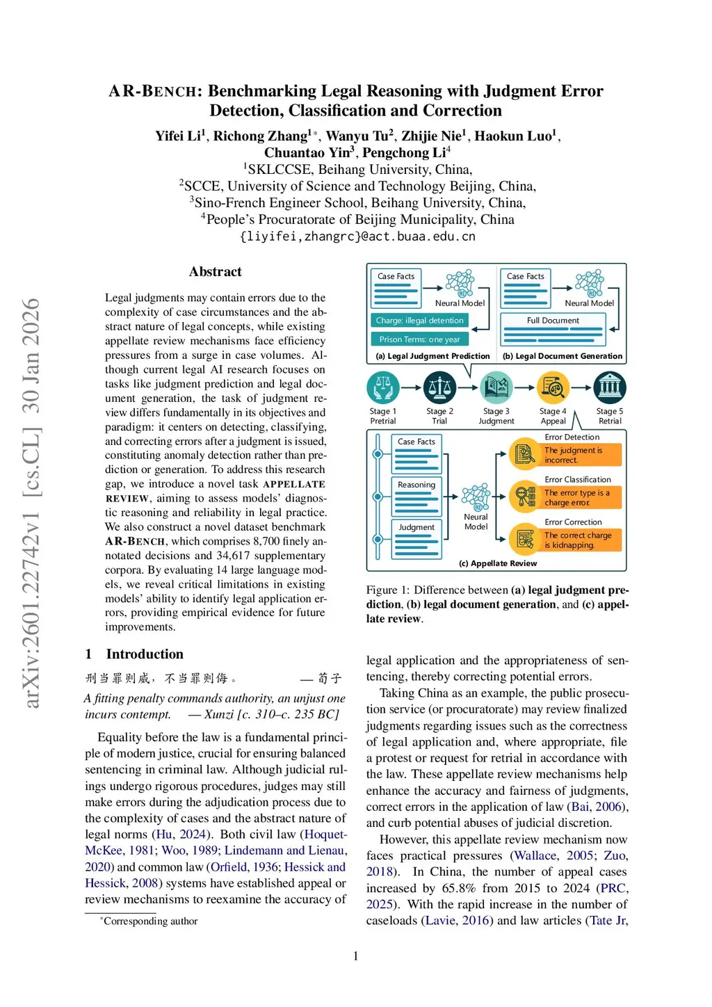 AR-BENCH: Benchmarking Legal Reasoning with Judgment Error Detection, Classification and Correction