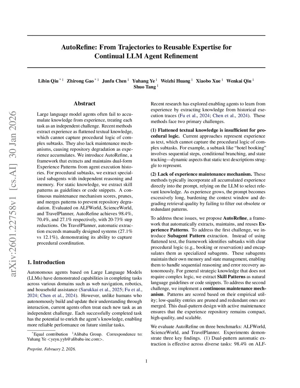 Large language model agents often fail to accumulate knowledge from experience, treating each task as an independent challenge. Recent methods extract experience as flattened textual knowledge, which cannot capture procedural logic of complex subtasks. They also lack maintenance mechanisms, causing repository degradation as experience accumulates. We introduce AutoRefine, a framework that extracts and maintains dual-form Experience Patterns from agent execution histories. For procedural subtasks, we extract specialized subagents with independent reasoning and memory. For static knowledge, we extract skill patterns as guidelines or code snippets. A continuous maintenance mechanism scores, prunes, and merges patterns to prevent repository degradation. Evaluated on ALFWorld, ScienceWorld, and TravelPlanner, AutoRefine achieves 98.4%, 70.4%, and 27.1% respectively, with 20-73% step reductions. On TravelPlanner, automatic extraction exceeds manually designed systems (27.1% vs 12.1%), demonstrating its ability to capture procedural coordination.