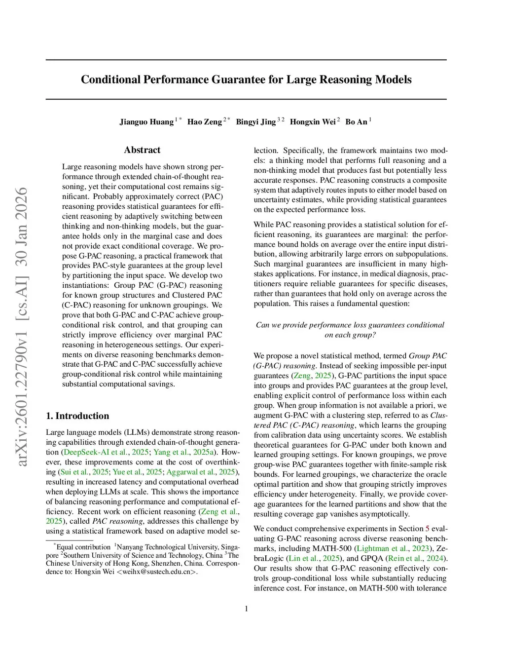 Large reasoning models have shown strong performance through extended chain-of-thought reasoning, yet their computational cost remains significant. Probably approximately correct (PAC) reasoning provides statistical guarantees for efficient reasoning by adaptively switching between thinking and non-thinking models, but the guarantee holds only in the marginal case and does not provide exact conditional coverage. We propose G-PAC reasoning, a practical framework that provides PAC-style guarantees at the group level by partitioning the input space. We develop two instantiations: Group PAC (G-PAC) reasoning for known group structures and Clustered PAC (C-PAC) reasoning for unknown groupings. We prove that both G-PAC and C-PAC achieve group-conditional risk control, and that grouping can strictly improve efficiency over marginal PAC reasoning in heterogeneous settings. Our experiments on diverse reasoning benchmarks demonstrate that G-PAC and C-PAC successfully achieve group-conditional risk control while maintaining substantial computational savings.