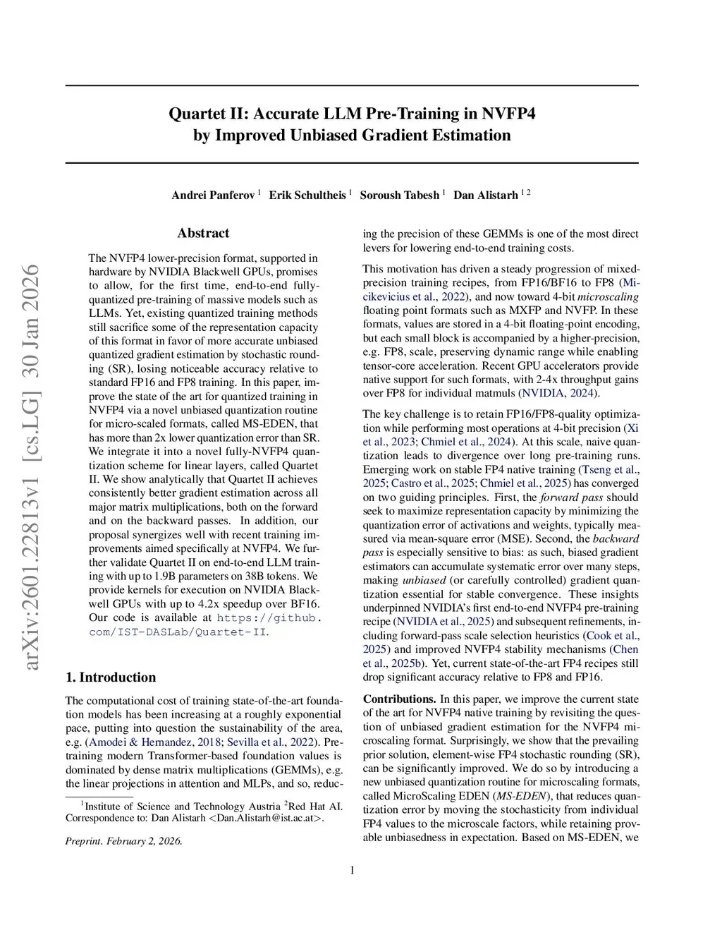 The NVFP4 lower-precision format, supported in hardware by NVIDIA Blackwell GPUs, promises to allow, for the first time, end-to-end fully-quantized pre-training of massive models such as LLMs. Yet, existing quantized training methods still sacrifice some of the representation capacity of this format in favor of more accurate unbiased quantized gradient estimation by stochastic rounding (SR), losing noticeable accuracy relative to standard FP16 and FP8 training. In this paper, improve the state of the art for quantized training in NVFP4 via a novel unbiased quantization routine for micro-scaled formats, called MS-EDEN, that has more than 2x lower quantization error than SR. We integrate it into a novel fully-NVFP4 quantization scheme for linear layers, called Quartet II. We show analytically that Quartet II achieves consistently better gradient estimation across all major matrix multiplications, both on the forward and on the backward passes. In addition, our proposal synergizes well with recent training improvements aimed specifically at NVFP4. We further validate Quartet II on end-to-end LLM training with up to 1.9B parameters on 38B tokens. We provide kernels for execution on NVIDIA Blackwell GPUs with up to 4.2x speedup over BF16. Our code is available atthis https URL.