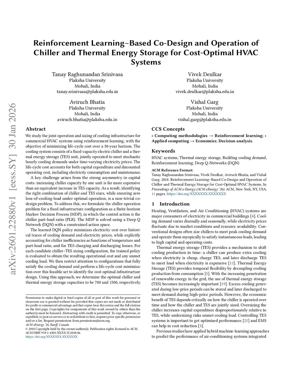 We study the joint operation and sizing of cooling infrastructure for commercial HVAC systems using reinforcement learning, with the objective of minimizing life-cycle cost over a 30-year horizon. The cooling system consists of a fixed-capacity electric chiller and a thermal energy storage (TES) unit, jointly operated to meet stochastic hourly cooling demands under time-varying electricity prices. The life-cycle cost accounts for both capital expenditure and discounted operating cost, including electricity consumption and maintenance. A key challenge arises from the strong asymmetry in capital costs: increasing chiller capacity by one unit is far more expensive than an equivalent increase in TES capacity. As a result, identifying the right combination of chiller and TES sizes, while ensuring zero loss-of-cooling-load under optimal operation, is a non-trivial co-design problem. To address this, we formulate the chiller operation problem for a fixed infrastructure configuration as a finite-horizon Markov Decision Process (MDP), in which the control action is the chiller part-load ratio (PLR). The MDP is solved using a Deep Q Network (DQN) with a constrained action space. The learned DQN RL policy minimizes electricity cost over historical traces of cooling demand and electricity prices. For each candidate chiller-TES sizing configuration, the trained policy is evaluated. We then restrict attention to configurations that fully satisfy the cooling demand and perform a life-cycle cost minimization over this feasible set to identify the cost-optimal infrastructure design. Using this approach, we determine the optimal chiller and thermal energy storage capacities to be 700 and 1500, respectively.