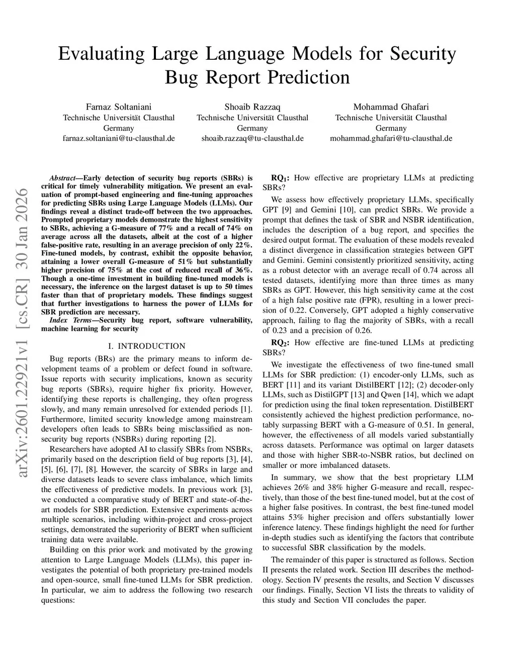 Early detection of security bug reports (SBRs) is critical for timely vulnerability mitigation. We present an evaluation of prompt-based engineering and fine-tuning approaches for predicting SBRs using Large Language Models (LLMs). Our findings reveal a distinct trade-off between the two approaches. Prompted proprietary models demonstrate the highest sensitivity to SBRs, achieving a G-measure of 77% and a recall of 74% on average across all the datasets, albeit at the cost of a higher false-positive rate, resulting in an average precision of only 22%. Fine-tuned models, by contrast, exhibit the opposite behavior, attaining a lower overall G-measure of 51% but substantially higher precision of 75% at the cost of reduced recall of 36%. Though a one-time investment in building fine-tuned models is necessary, the inference on the largest dataset is up to 50 times faster than that of proprietary models. These findings suggest that further investigations to harness the power of LLMs for SBR prediction are necessary.