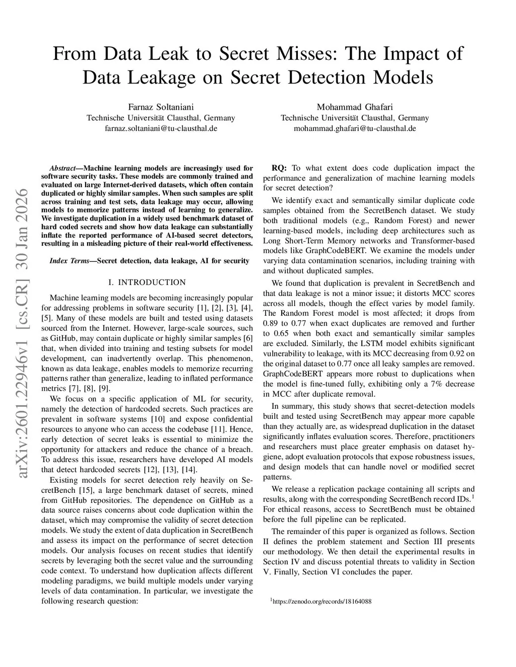 Machine learning models are increasingly used for software security tasks. These models are commonly trained and evaluated on large Internet-derived datasets, which often contain duplicated or highly similar samples. When such samples are split across training and test sets, data leakage may occur, allowing models to memorize patterns instead of learning to generalize. We investigate duplication in a widely used benchmark dataset of hard coded secrets and show how data leakage can substantially inflate the reported performance of AI-based secret detectors, resulting in a misleading picture of their real-world effectiveness.