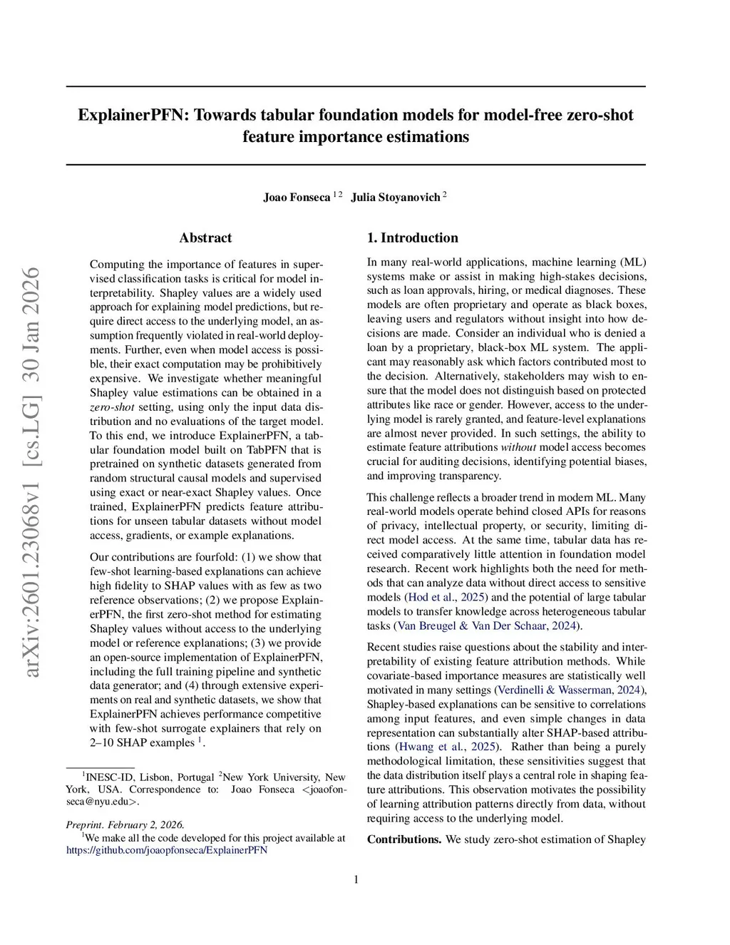 Computing the importance of features in supervised classification tasks is critical for model interpretability. Shapley values are a widely used approach for explaining model predictions, but require direct access to the underlying model, an assumption frequently violated in real-world deployments. Further, even when model access is possible, their exact computation may be prohibitively expensive. We investigate whether meaningful Shapley value estimations can be obtained in a zero-shot setting, using only the input data distribution and no evaluations of the target model. To this end, we introduce ExplainerPFN, a tabular foundation model built on TabPFN that is pretrained on synthetic datasets generated from random structural causal models and supervised using exact or near-exact Shapley values. Once trained, ExplainerPFN predicts feature attributions for unseen tabular datasets without model access, gradients, or example explanations.Our contributions are fourfold: (1) we show that few-shot learning-based explanations can achieve high fidelity to SHAP values with as few as two reference observations; (2) we propose ExplainerPFN, the first zero-shot method for estimating Shapley values without access to the underlying model or reference explanations; (3) we provide an open-source implementation of ExplainerPFN, including the full training pipeline and synthetic data generator; and (4) through extensive experiments on real and synthetic datasets, we show that ExplainerPFN achieves performance competitive with few-shot surrogate explainers that rely on 2-10 SHAP examples.