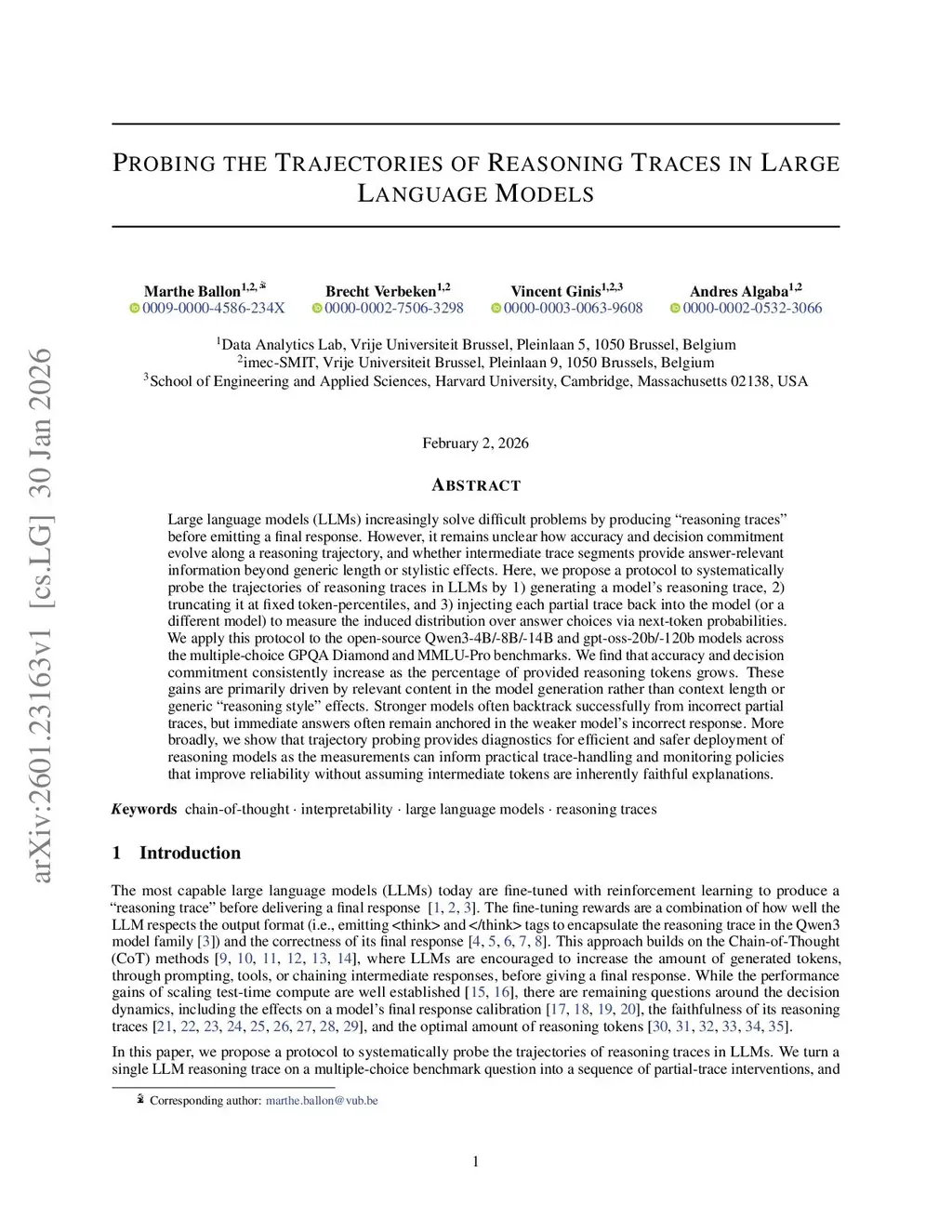 Large language models (LLMs) increasingly solve difficult problems by producing "reasoning traces" before emitting a final response. However, it remains unclear how accuracy and decision commitment evolve along a reasoning trajectory, and whether intermediate trace segments provide answer-relevant information beyond generic length or stylistic effects. Here, we propose a protocol to systematically probe the trajectories of reasoning traces in LLMs by 1) generating a model's reasoning trace, 2) truncating it at fixed token-percentiles, and 3) injecting each partial trace back into the model (or a different model) to measure the induced distribution over answer choices via next-token probabilities. We apply this protocol to the open-source Qwen3-4B/-8B/-14B and gpt-oss-20b/-120b models across the multiple-choice GPQA Diamond and MMLU-Pro benchmarks. We find that accuracy and decision commitment consistently increase as the percentage of provided reasoning tokens grows. These gains are primarily driven by relevant content in the model generation rather than context length or generic "reasoning style" effects. Stronger models often backtrack successfully from incorrect partial traces, but immediate answers often remain anchored in the weaker model's incorrect response. More broadly, we show that trajectory probing provides diagnostics for efficient and safer deployment of reasoning models as the measurements can inform practical trace-handling and monitoring policies that improve reliability without assuming intermediate tokens are inherently faithful explanations.