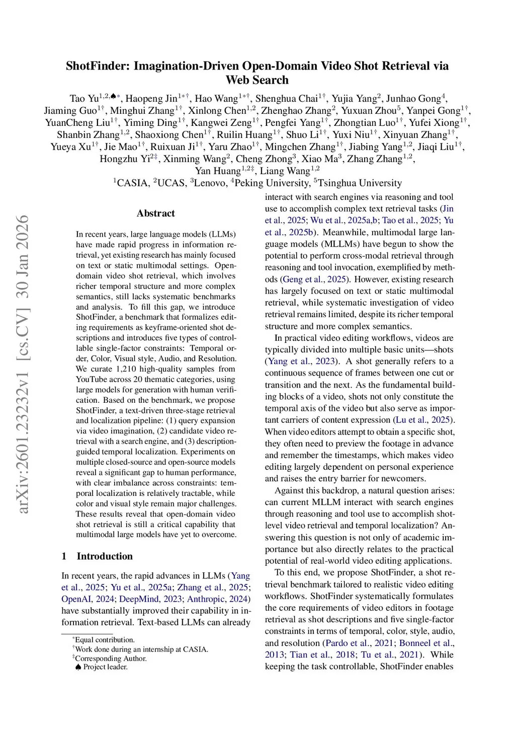 In recent years, large language models (LLMs) have made rapid progress in information retrieval, yet existing research has mainly focused on text or static multimodal settings. Open-domain video shot retrieval, which involves richer temporal structure and more complex semantics, still lacks systematic benchmarks and analysis. To fill this gap, we introduce ShotFinder, a benchmark that formalizes editing requirements as keyframe-oriented shot descriptions and introduces five types of controllable single-factor constraints: Temporal order, Color, Visual style, Audio, and Resolution. We curate 1,210 high-quality samples from YouTube across 20 thematic categories, using large models for generation with human verification. Based on the benchmark, we propose ShotFinder, a text-driven three-stage retrieval and localization pipeline: (1) query expansion via video imagination, (2) candidate video retrieval with a search engine, and (3) description-guided temporal localization. Experiments on multiple closed-source and open-source models reveal a significant gap to human performance, with clear imbalance across constraints: temporal localization is relatively tractable, while color and visual style remain major challenges. These results reveal that open-domain video shot retrieval is still a critical capability that multimodal large models have yet to overcome.