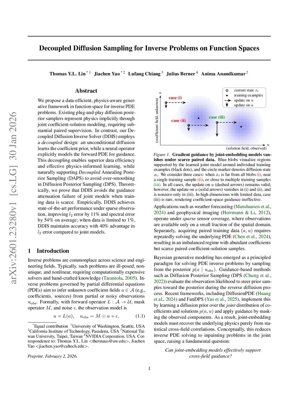 We propose a data-efficient, physics-aware generative framework in function space for inverse PDE problems. Existing plug-and-play diffusion posterior samplers represent physics implicitly through joint coefficient-solution modeling, requiring substantial paired supervision. In contrast, our Decoupled Diffusion Inverse Solver (DDIS) employs a decoupled design: an unconditional diffusion learns the coefficient prior, while a neural operator explicitly models the forward PDE for guidance. This decoupling enables superior data efficiency and effective physics-informed learning, while naturally supporting Decoupled Annealing Posterior Sampling (DAPS) to avoid over-smoothing in Diffusion Posterior Sampling (DPS). Theoretically, we prove that DDIS avoids the guidance attenuation failure of joint models when training data is scarce. Empirically, DDIS achieves state-of-the-art performance under sparse observation, improving error by 11% and spectral error by 54% on average; when data is limited to 1%, DDIS maintains accuracy with 40% advantage in error compared to joint models.