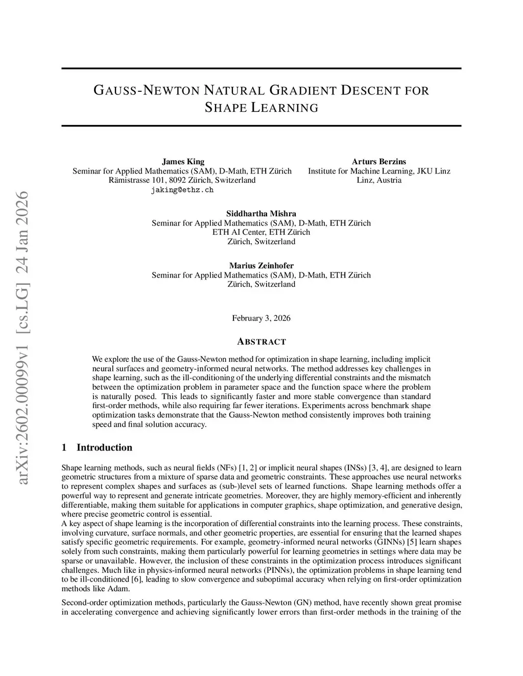 We explore the use of the Gauss-Newton method for optimization in shape learning, including implicit neural surfaces and geometry-informed neural networks. The method addresses key challenges in shape learning, such as the ill-conditioning of the underlying differential constraints and the mismatch between the optimization problem in parameter space and the function space where the problem is naturally posed. This leads to significantly faster and more stable convergence than standard first-order methods, while also requiring far fewer iterations. Experiments across benchmark shape optimization tasks demonstrate that the Gauss-Newton method consistently improves both training speed and final solution accuracy.