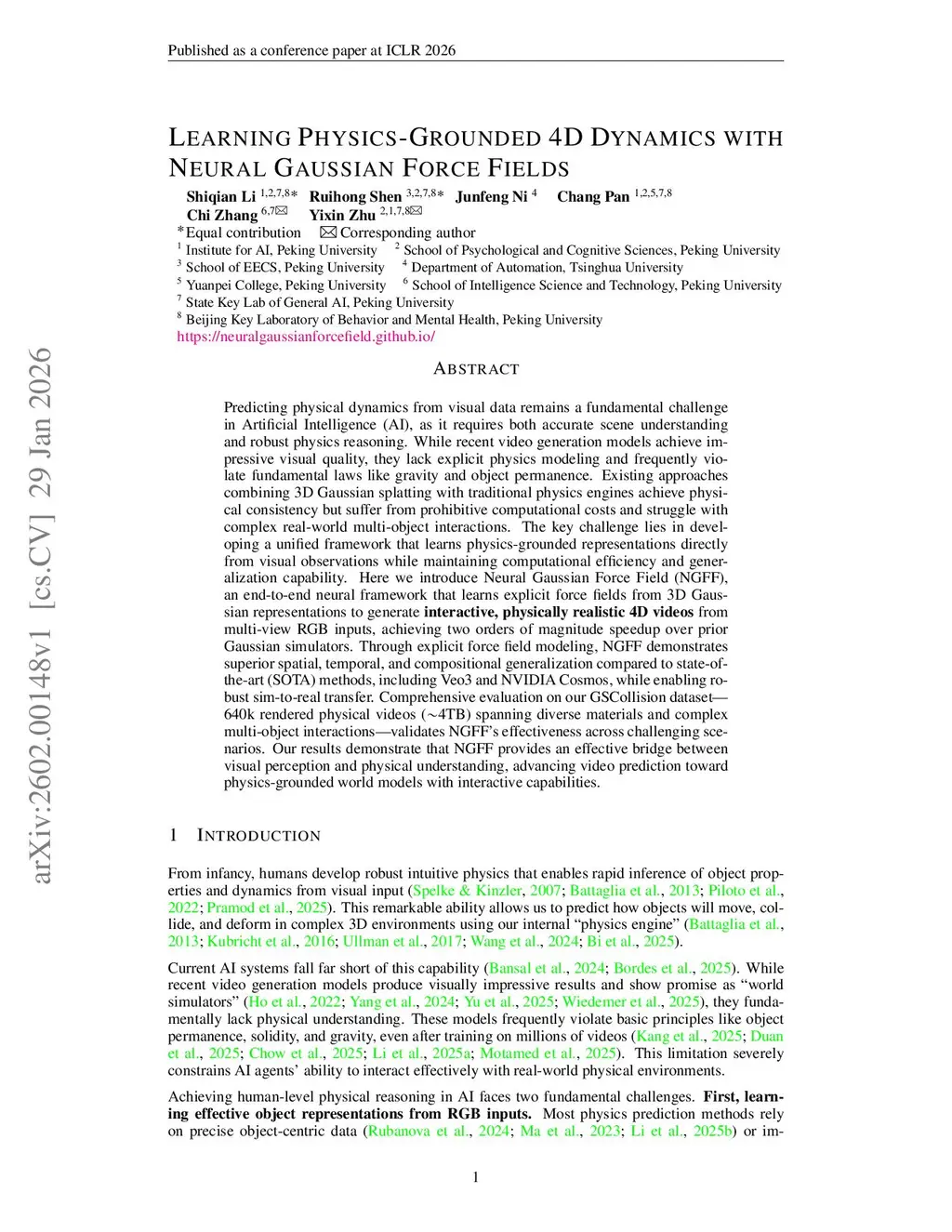 Predicting physical dynamics from raw visual data remains a major challenge in AI. While recent video generation models have achieved impressive visual quality, they still cannot consistently generate physically plausible videos due to a lack of modeling of physical laws. Recent approaches combining 3D Gaussian splatting and physics engines can produce physically plausible videos, but are hindered by high computational costs in both reconstruction and simulation, and often lack robustness in complex real-world scenarios. To address these issues, we introduce Neural Gaussian Force Field (NGFF), an end-to-end neural framework that integrates 3D Gaussian perception with physics-based dynamic modeling to generate interactive, physically realistic 4D videos from multi-view RGB inputs, achieving two orders of magnitude faster than prior Gaussian simulators. To support training, we also present GSCollision, a 4D Gaussian dataset featuring diverse materials, multi-object interactions, and complex scenes, totaling over 640k rendered physical videos (~4 TB). Evaluations on synthetic and real 3D scenarios show NGFF's strong generalization and robustness in physical reasoning, advancing video prediction towards physics-grounded world models.