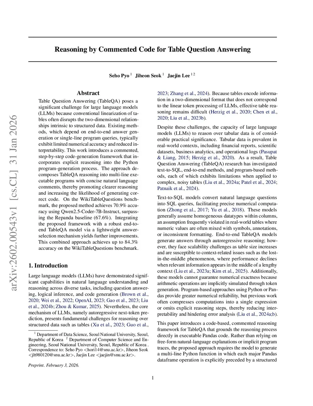 Table Question Answering (TableQA) poses a significant challenge for large language models (LLMs) because conventional linearization of tables often disrupts the two-dimensional relationships intrinsic to structured data. Existing methods, which depend on end-to-end answer generation or single-line program queries, typically exhibit limited numerical accuracy and reduced interpretability. This work introduces a commented, step-by-step code-generation framework that incorporates explicit reasoning into the Python program-generation process. The approach decomposes TableQA reasoning into multi-line executable programs with concise natural language comments, thereby promoting clearer reasoning and increasing the likelihood of generating correct code. On the WikiTableQuestions benchmark, the proposed method achieves 70.9\% accuracy using Qwen2.5-Coder-7B-Instruct, surpassing the Repanda baseline (67.6\%). Integrating the proposed framework with a robust end-to-end TableQA model via a lightweight answer-selection mechanism yields further improvements. This combined approach achieves up to 84.3\% accuracy on the WikiTableQuestions benchmark.