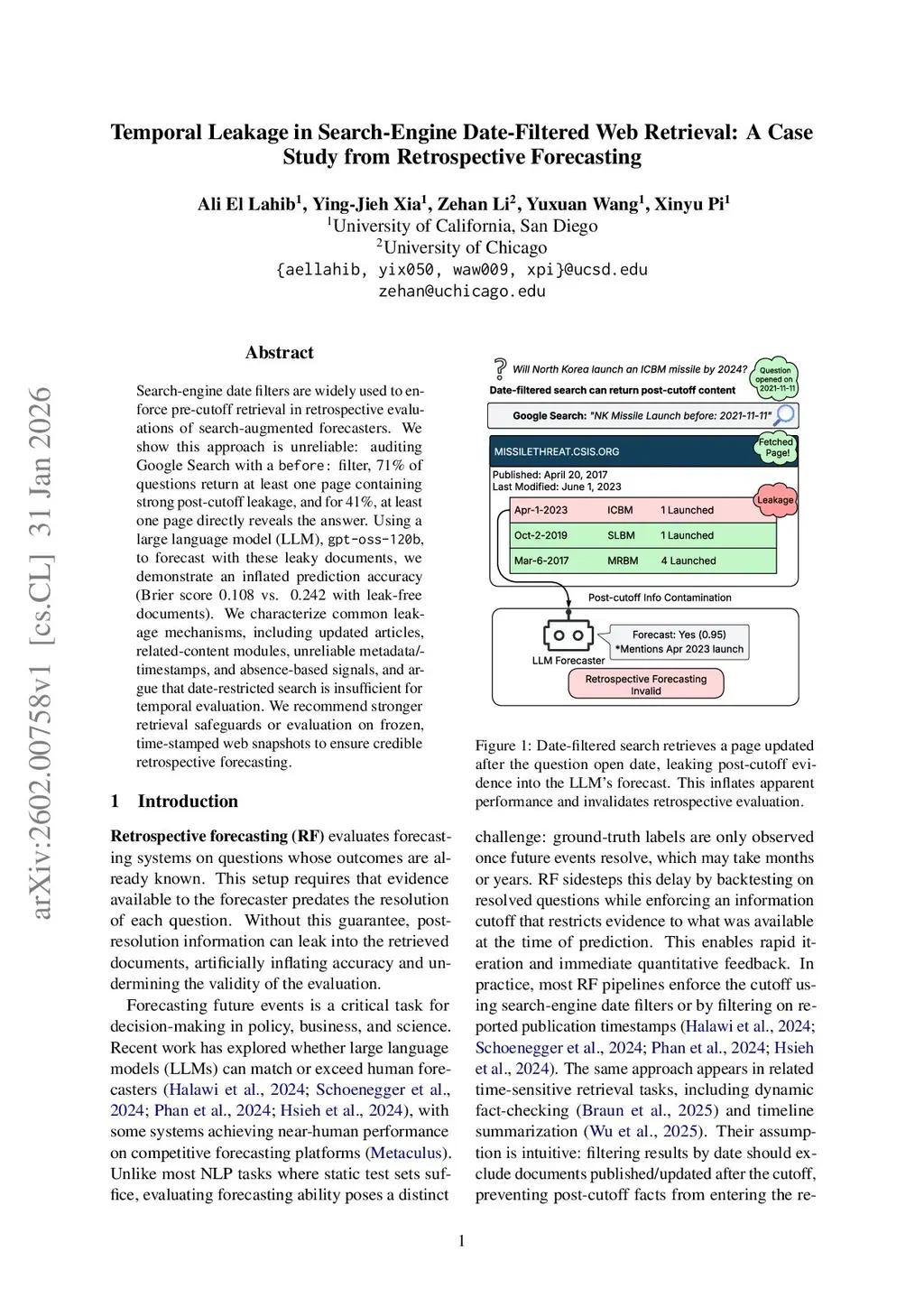 Search-engine date filters are widely used to enforce pre-cutoff retrieval in retrospective evaluations of search-augmented forecasters. We show this approach is unreliable: auditing Google Search with a before: filter, 71% of questions return at least one page containing strong post-cutoff leakage, and for 41%, at least one page directly reveals the answer. Using a large language model (LLM), gpt-oss-120b, to forecast with these leaky documents, we demonstrate an inflated prediction accuracy (Brier score 0.108 vs. 0.242 with leak-free documents). We characterize common leakage mechanisms, including updated articles, related-content modules, unreliable metadata/timestamps, and absence-based signals, and argue that date-restricted search is insufficient for temporal evaluation. We recommend stronger retrieval safeguards or evaluation on frozen, time-stamped web snapshots to ensure credible retrospective forecasting.