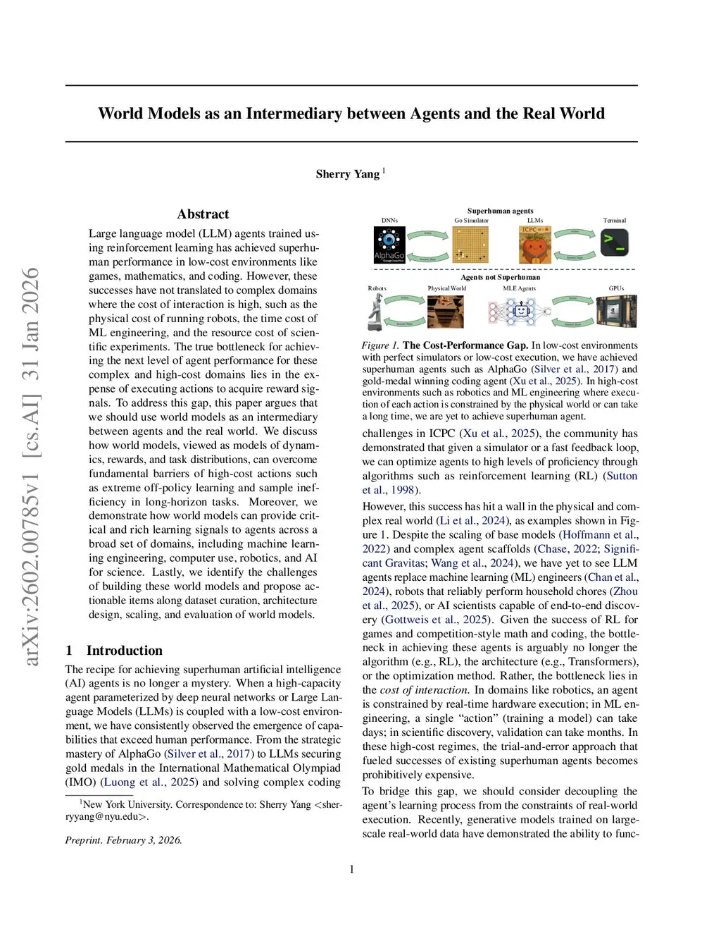 Large language model (LLM) agents trained using reinforcement learning has achieved superhuman performance in low-cost environments like games, mathematics, and coding. However, these successes have not translated to complex domains where the cost of interaction is high, such as the physical cost of running robots, the time cost of ML engineering, and the resource cost of scientific experiments. The true bottleneck for achieving the next level of agent performance for these complex and high-cost domains lies in the expense of executing actions to acquire reward signals. To address this gap, this paper argues that we should use world models as an intermediary between agents and the real world. We discuss how world models, viewed as models of dynamics, rewards, and task distributions, can overcome fundamental barriers of high-cost actions such as extreme off-policy learning and sample inefficiency in long-horizon tasks. Moreover, we demonstrate how world models can provide critical and rich learning signals to agents across a broad set of domains, including machine learning engineering, computer use, robotics, and AI for science. Lastly, we identify the challenges of building these world models and propose actionable items along dataset curation, architecture design, scaling, and evaluation of world models.